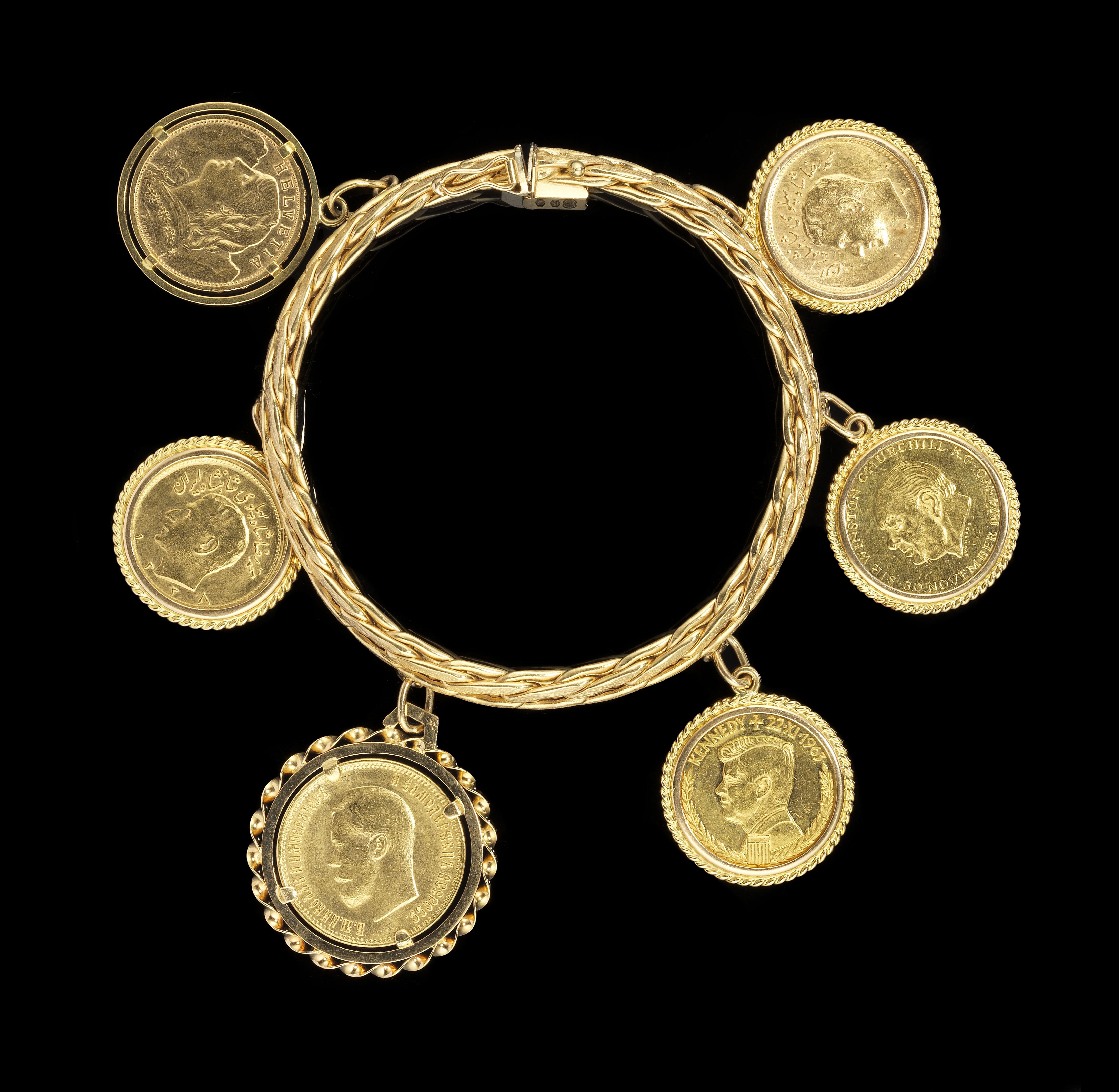 3537. Bracelet à maille gourmette stylisée retenant six pièces en pendeloques