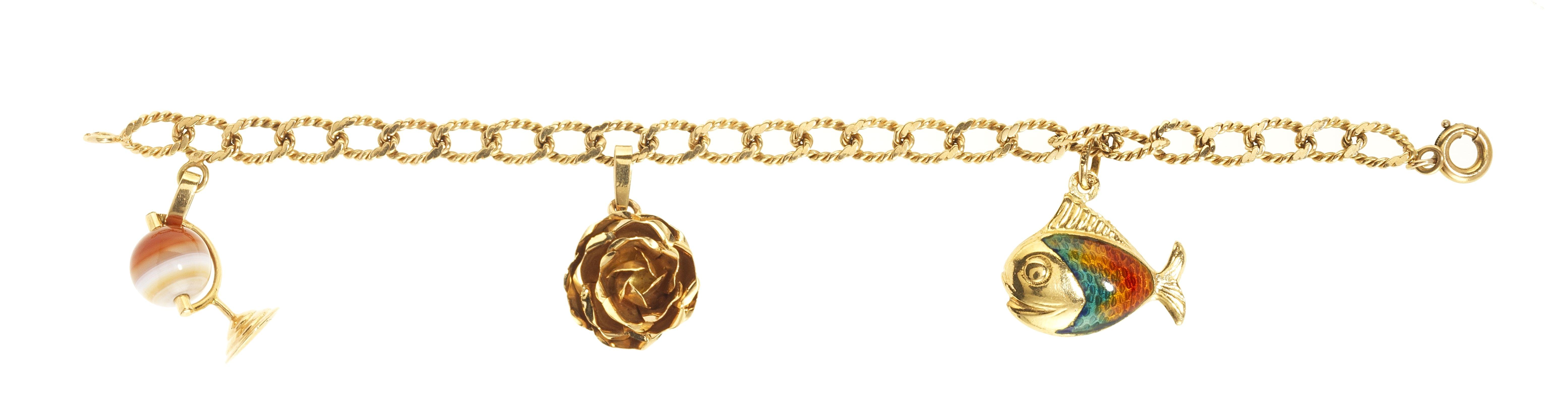 L'une à motif d'un poisson émaillé, l'une à motif d'une rose et la dernière à motif d'un globe terrestre en agate, or 750, L 15 cm, poids brut 13 g