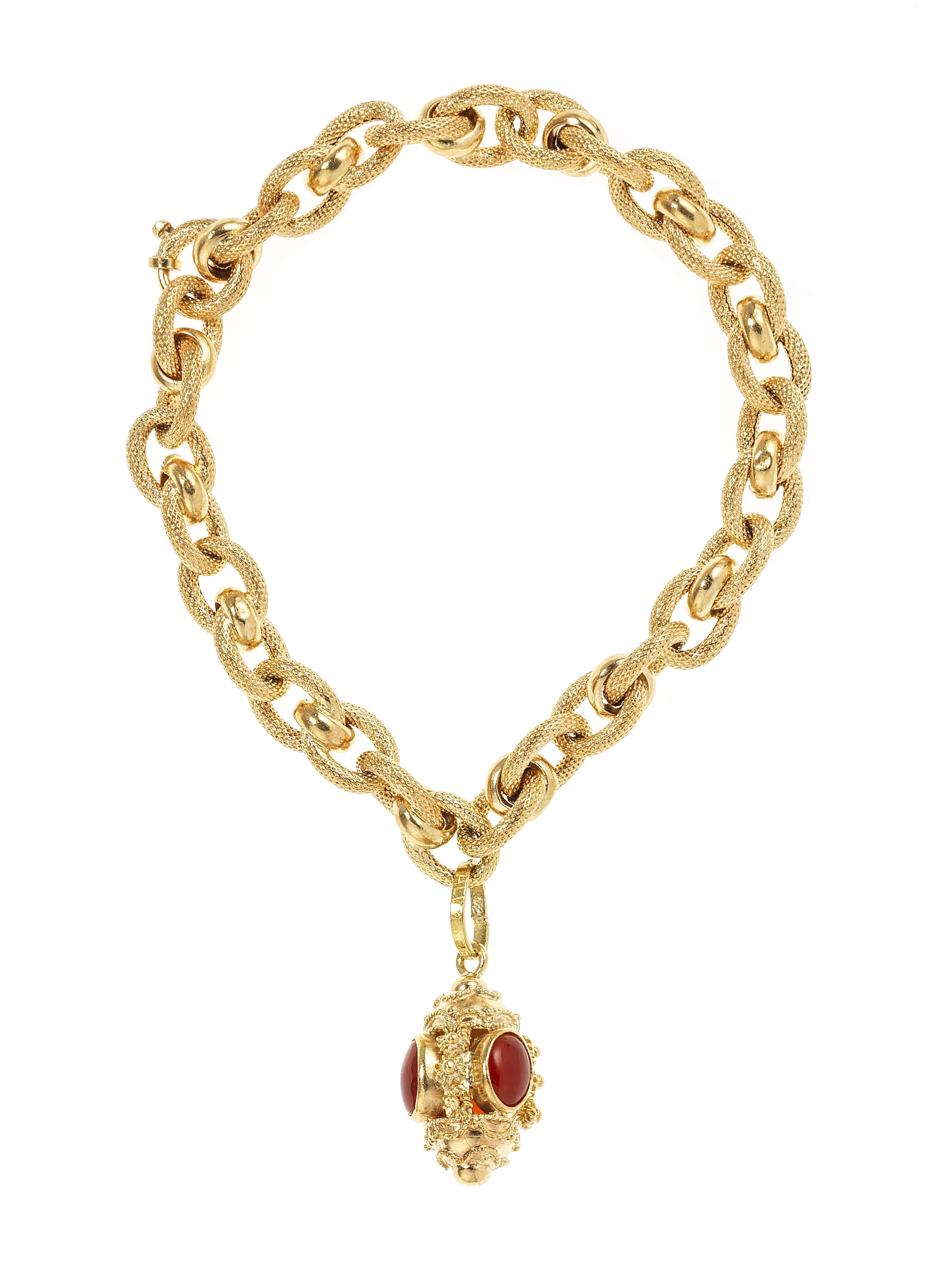 Retenant une pendeloque ajourée à décor de granulation et sertie de cornalines taille cabochon ovale, or 750, L 19 cm, 15 g