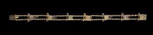 Sertis de saphirs et de rubis rehaussés de diamants taille rose et formant le mot "Dearest" en signal maritime Or, poinçons d'importation Autriche-Hongrie entre 1901 et 1921, numéroté, L 17,5 cm, 12 g. Provenance Habsbourg: succession de l'archiduc Albert II d'Autrich-Teschen