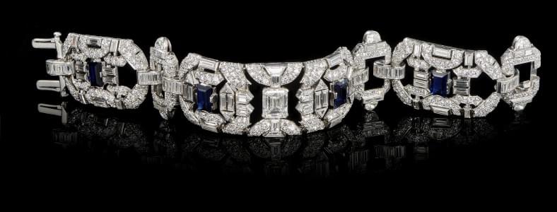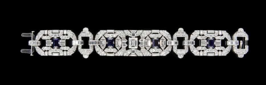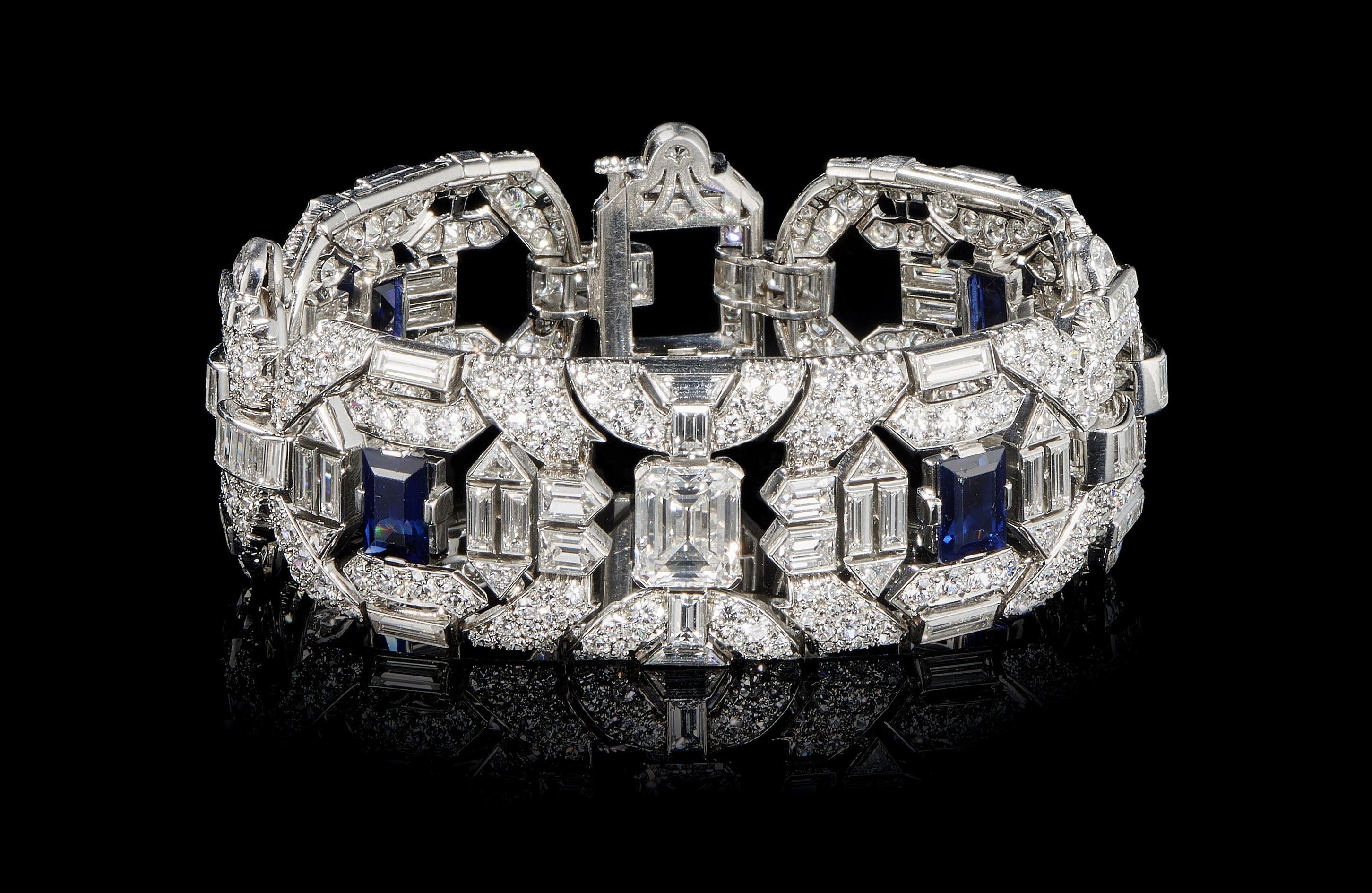 Centré d'un diamant taille émeraude (2,97 ct, G, VS1), serti de saphirs taille rectangle (env. 5 ct) et pavé de diamants taille baguette et brillant (env. 15 ct), platine 900, cliquet de sécurité et lame du fermoir en platine 750 selon le Contrôle des métaux précieux, L 18 cm, poids brut 70 g, avec son certificat GIA