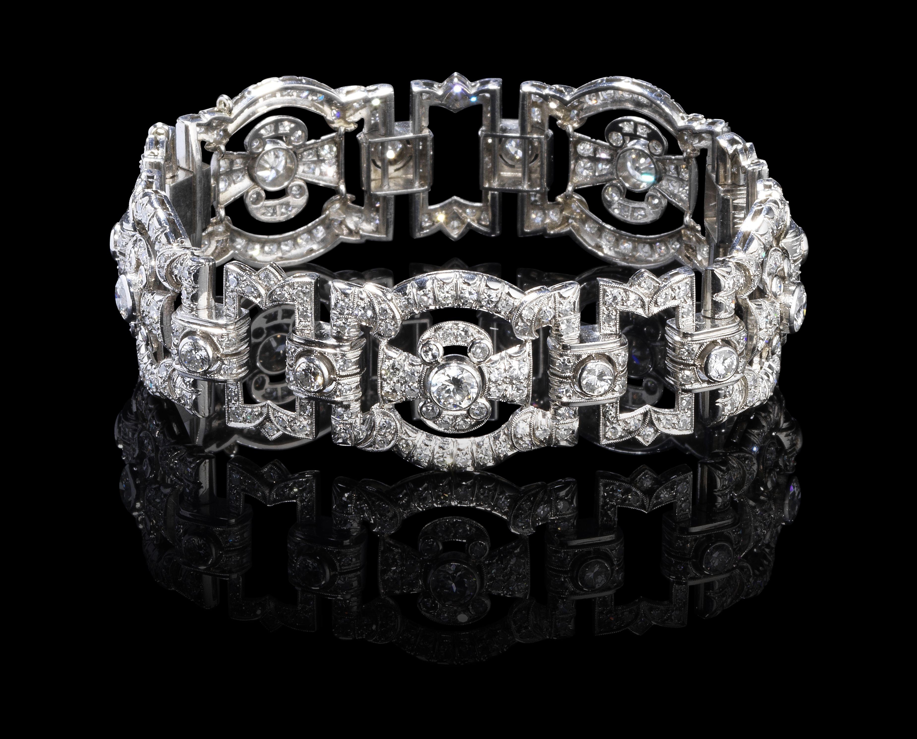 242. Bracelet Art déco composé de cinq motifs ajourés pavés de diamants taille brillant et 8/8 (env. 5 ct)