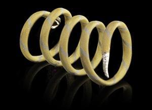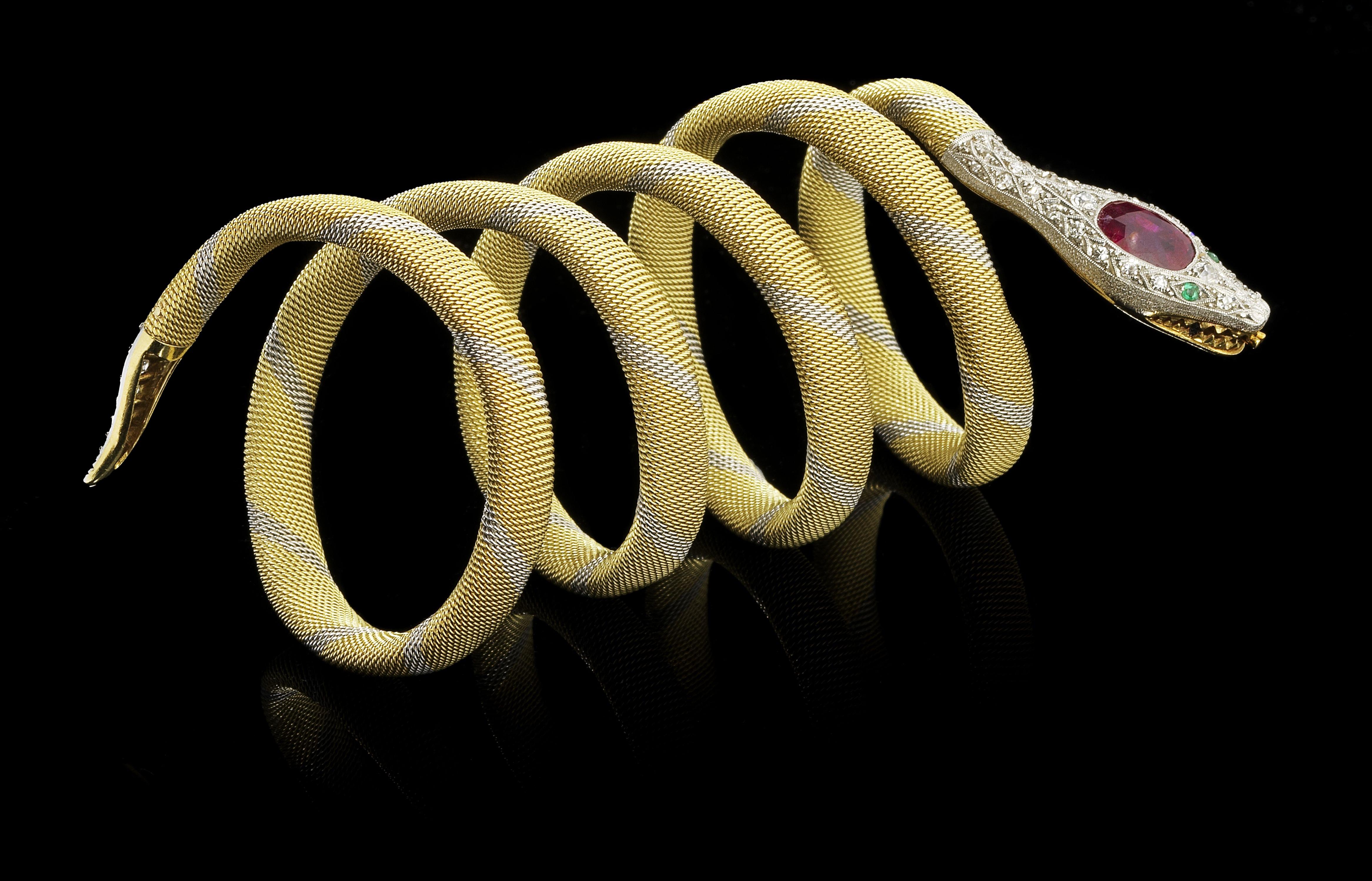 Aux yeux sertis d'émeraudes, à la tête sertie d'un rubis taille ovale (env. 1,7 ct) et pavée de diamants taille ancienne et 8/8, or et or gris 750, dans un écrin Golay et Stahl Genève, taille ajustable, 42 g