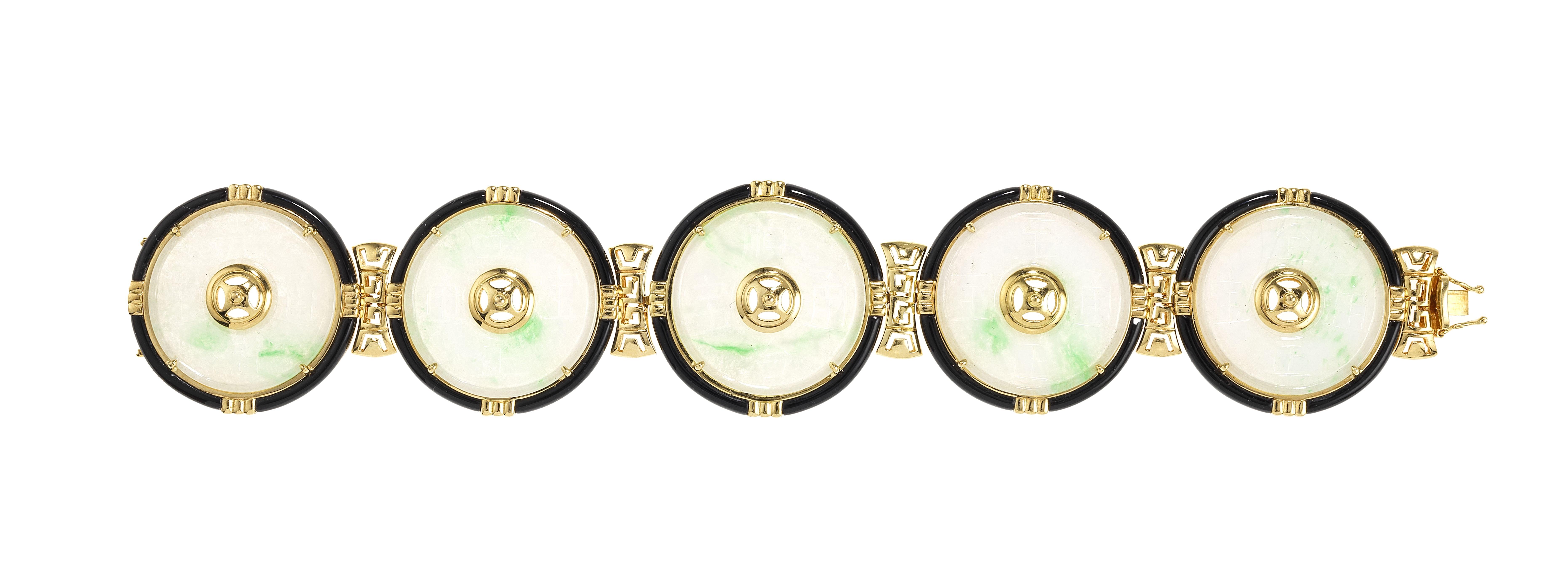 3421. Bracelet composé de cinq disques de jade sculptés entourés d'onyx