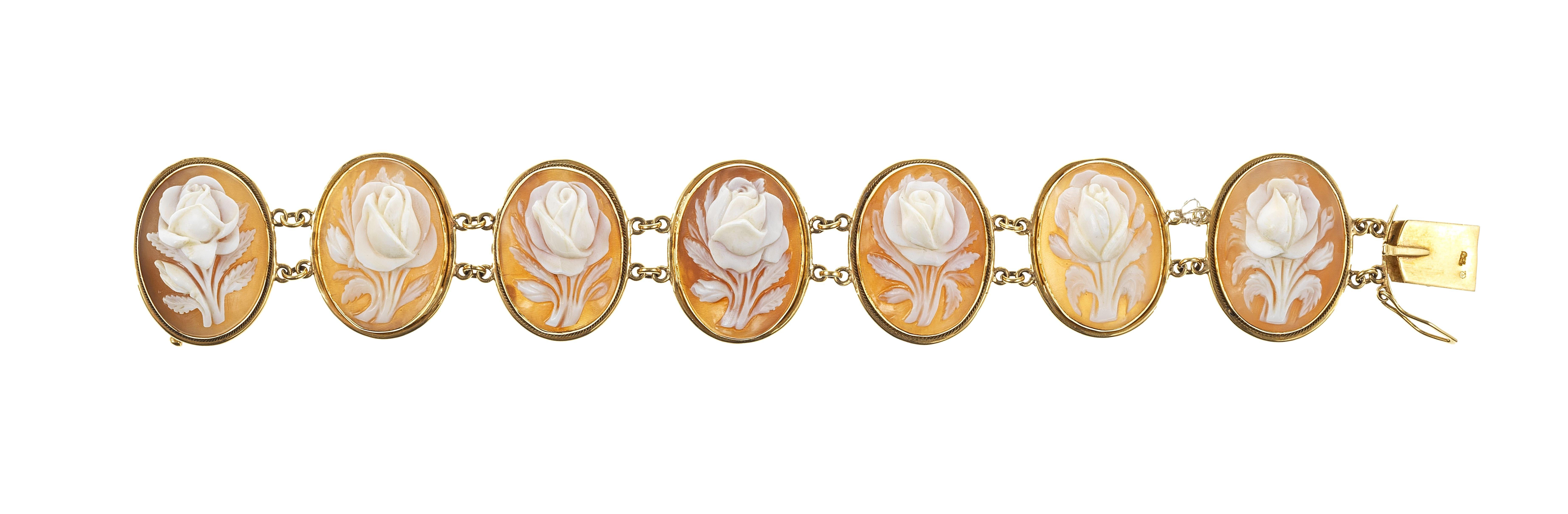 3392. Bracelet composé de sept médaillons retenant des camées sculptés à décor de fleur sur coquillage