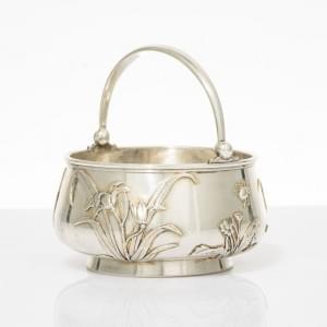 129. Petit panier à anse amovible et décor Art Nouveau de fleurs et i...