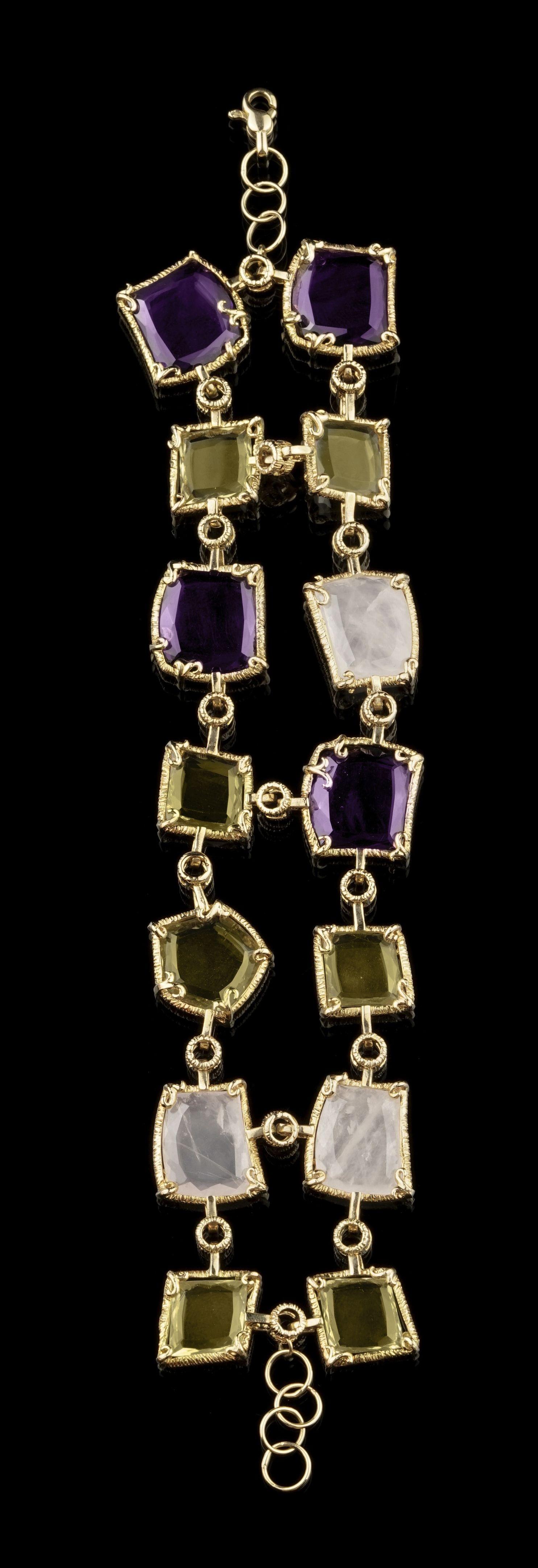 707. Bracelet deux rangs de quartz taille fantaisie (améthystes, quartz rose, prasiolites)