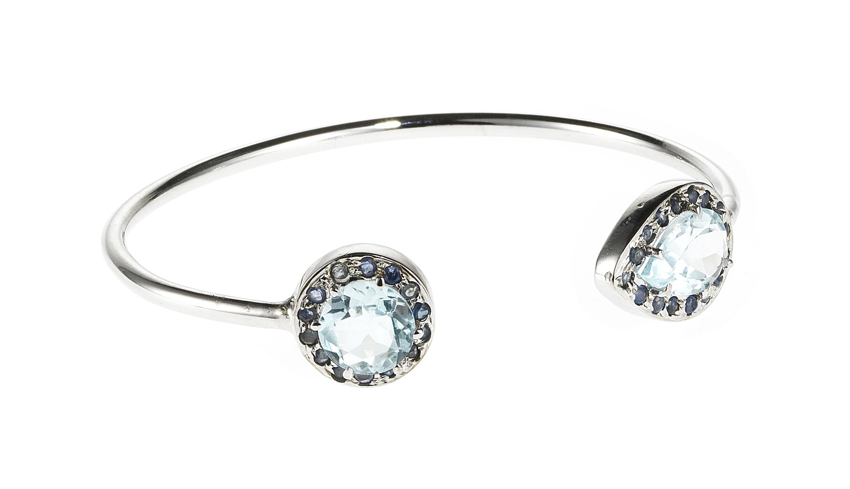 3091. *Bracelet jonc ouvert serti de deux topazes bleues, l'une taille poire (env. 3 ct) et l'autre taille brillant (env. 2 ct)