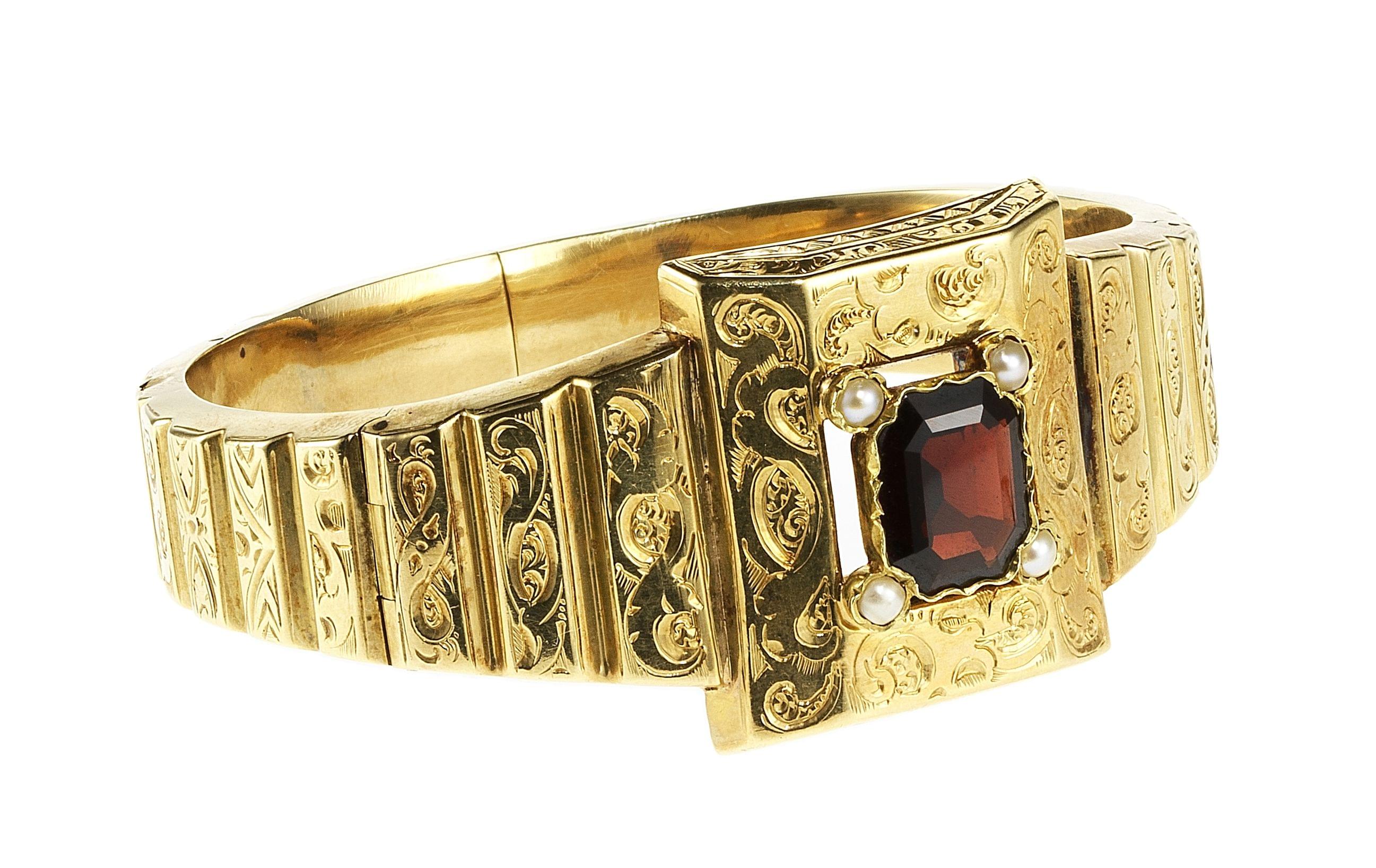 3374. Bracelet jonc ouvrant ciselé serti d'un grenat taille rectangle à pans coupés rehaussé de quatre demi-perles