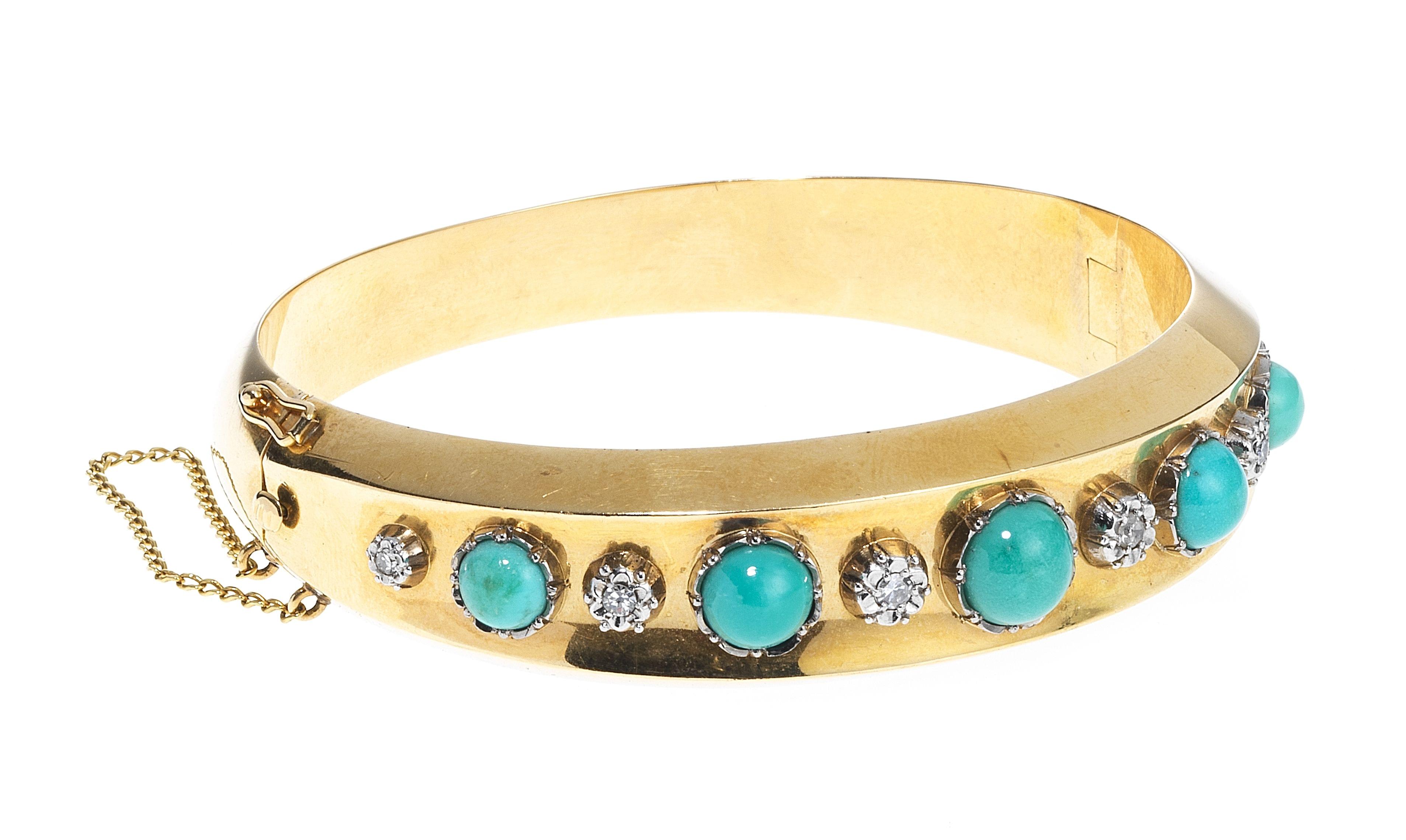 3386. Bracelet jonc ouvrant serti de turquoises taille cabochon alternées de diamants taille 8/8