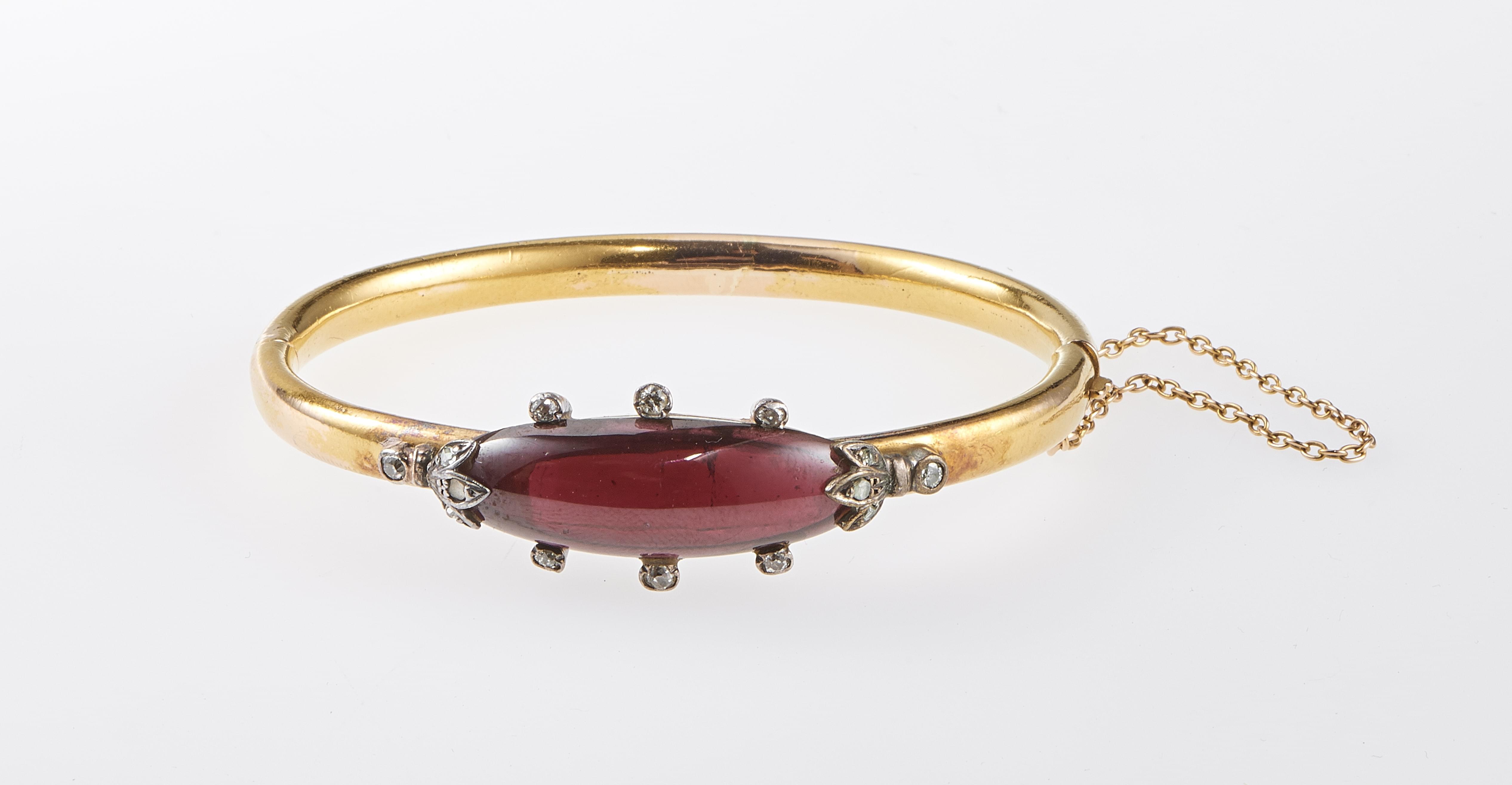3297. Bracelet jonc ouvrant serti d'un grenat taille cabochon rehaussé de diamants