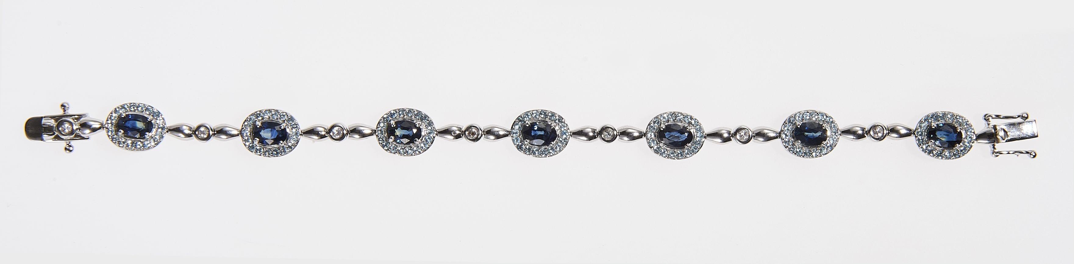 3221. Bracelet ligne composé de motifs sertis de saphirs taille ovale (env. 4 ct) entourés de topazes bleues et ponctués de saphirs blancs