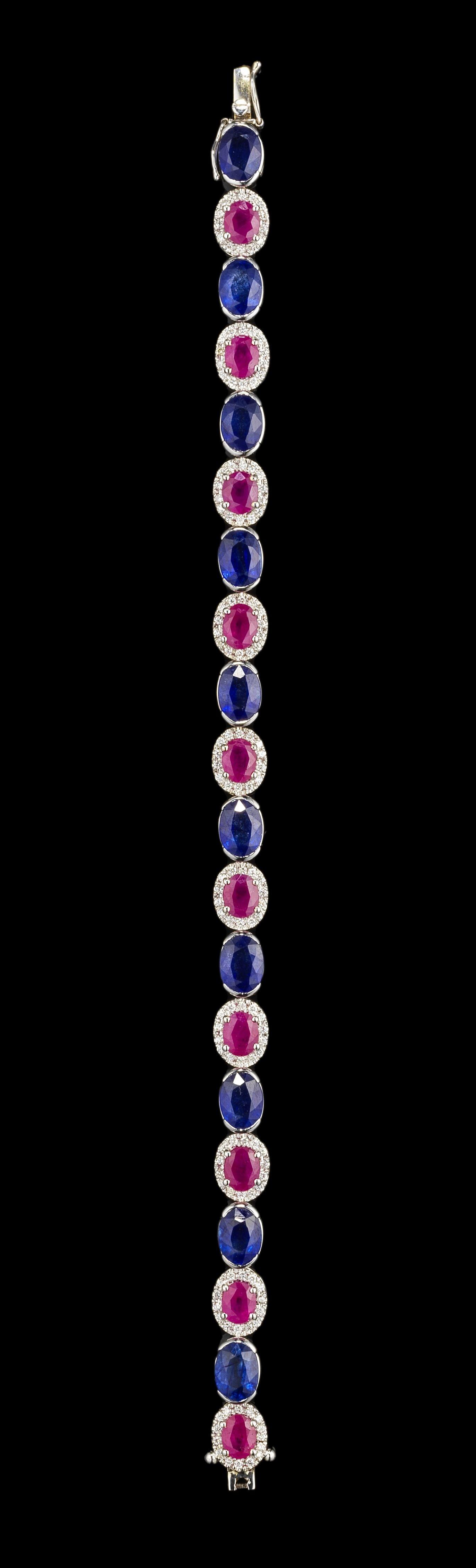 Alternés de motifs sertis de rubis taille ovale (env. 8,5 ct) entourés de diamants (env. 1 ct), or gris 750, L 18,5 cm, 18 g, accompagné d'un certificat GRA. Pour les lots précédés d’un *, la TVA de 7.7% est due sur l’entier du prix d’adjudication.