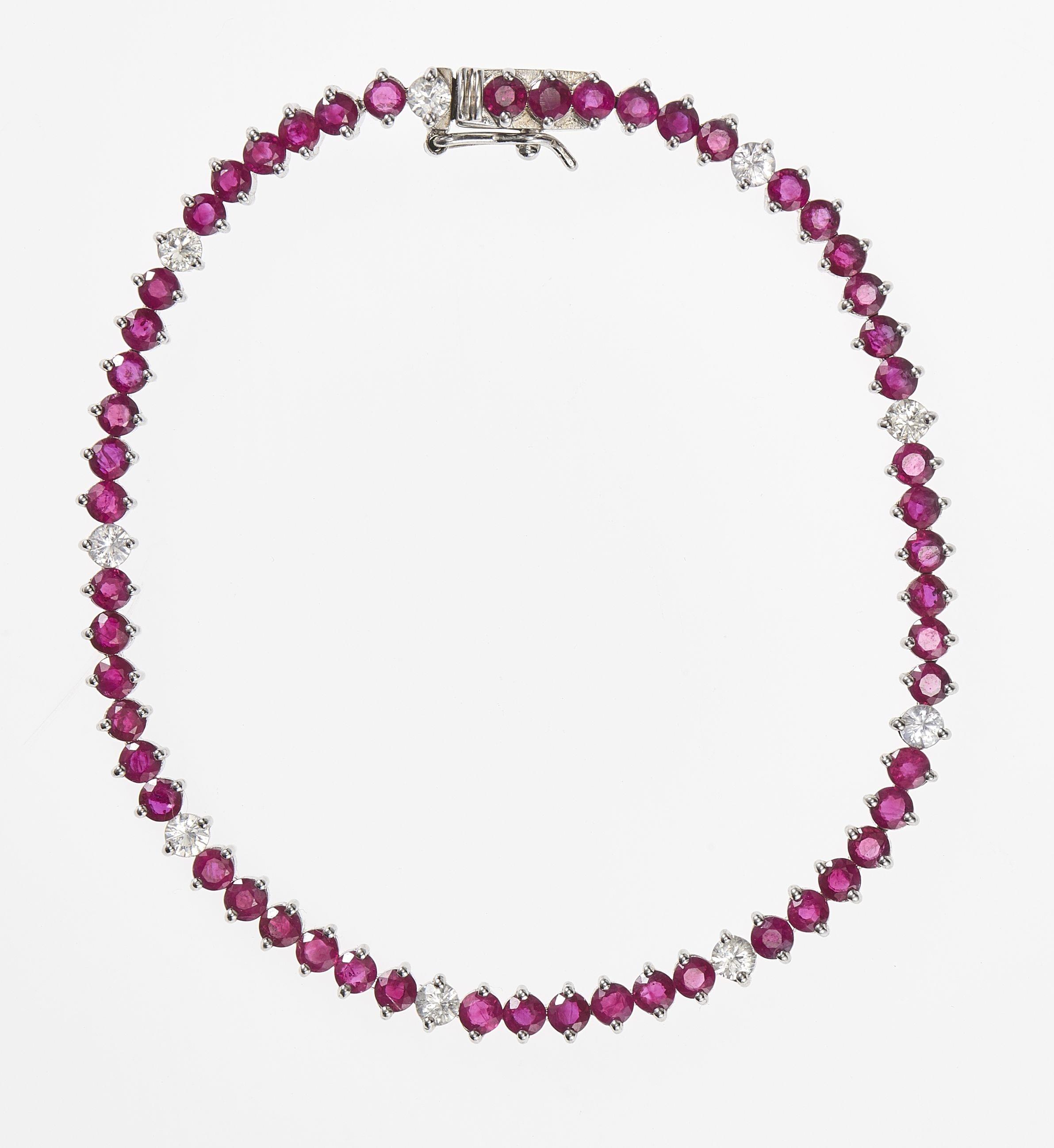 3222. Bracelet ligne serti de rubis taille brillant (env. 2,5 ct) ponctués de saphirs blancs