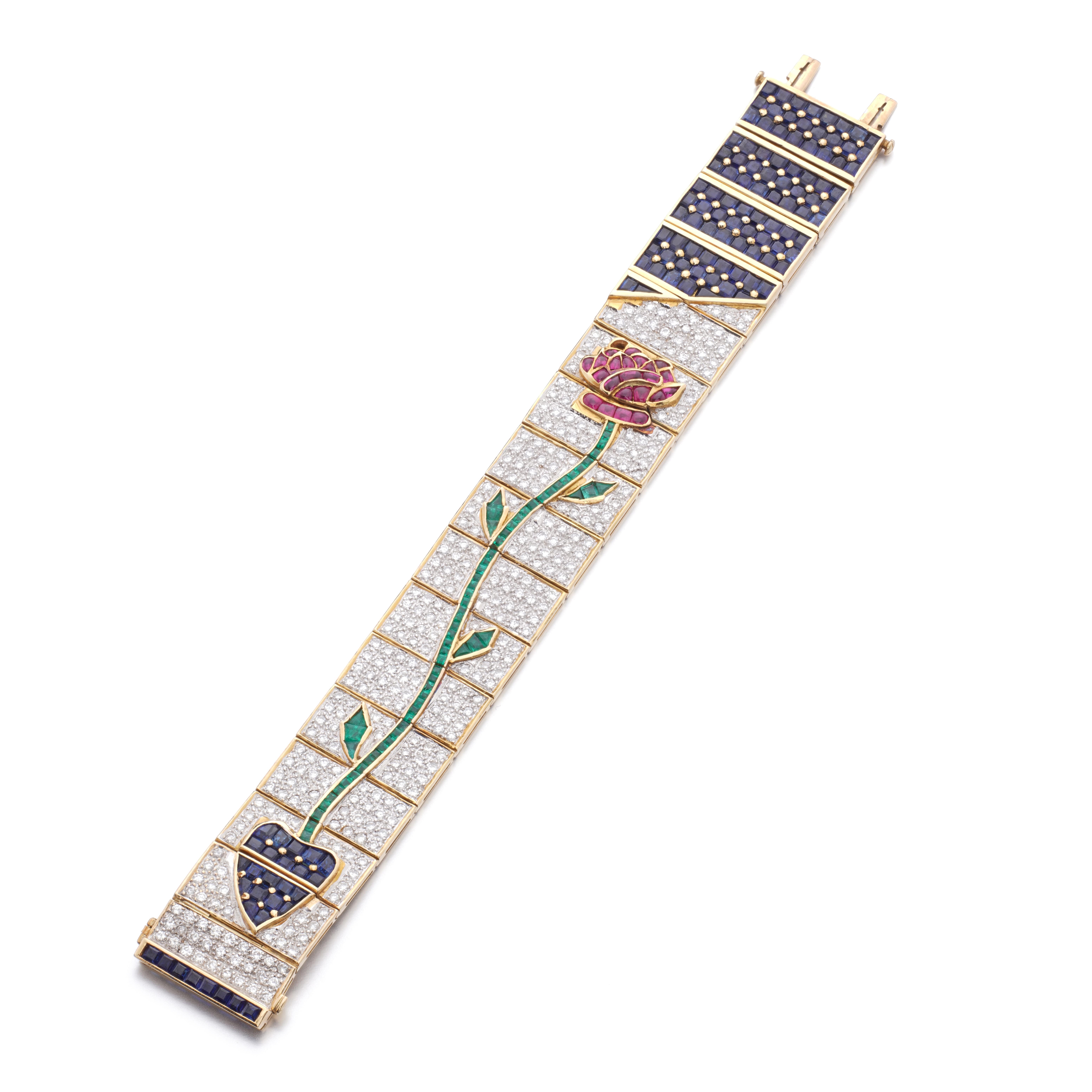 Aux pétales formés de rubis calibrés (un manque), à la tige composée d'émeraudes et à la base pavée de saphirs, le tout dans un pavage de diamants et terminé par un pavage de saphirs, or 750, L 18 cm, 61 g