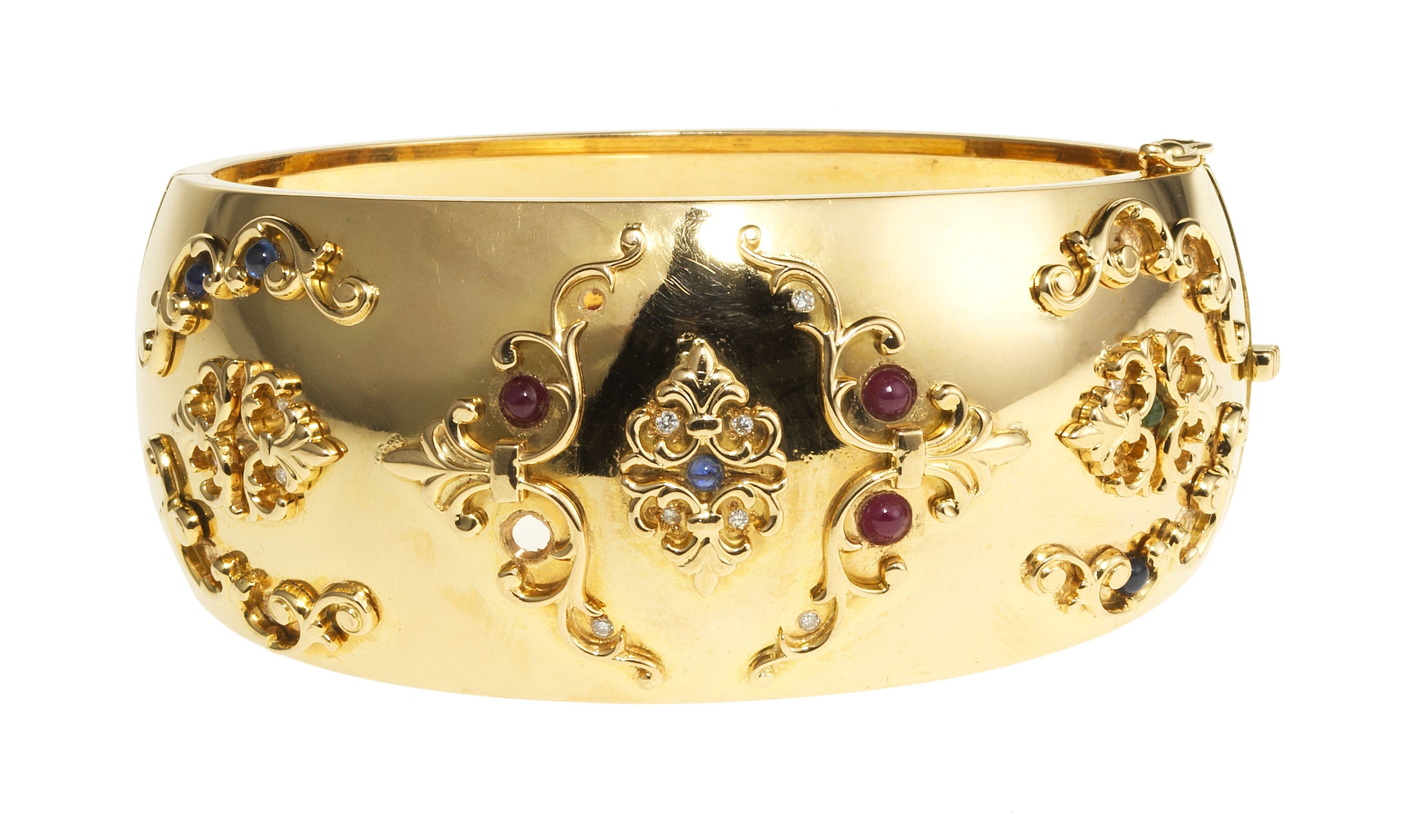 3538. Bracelet manchette ouvrant orné de volutes et fleurs de lys serties de saphirs, rubis et diamants