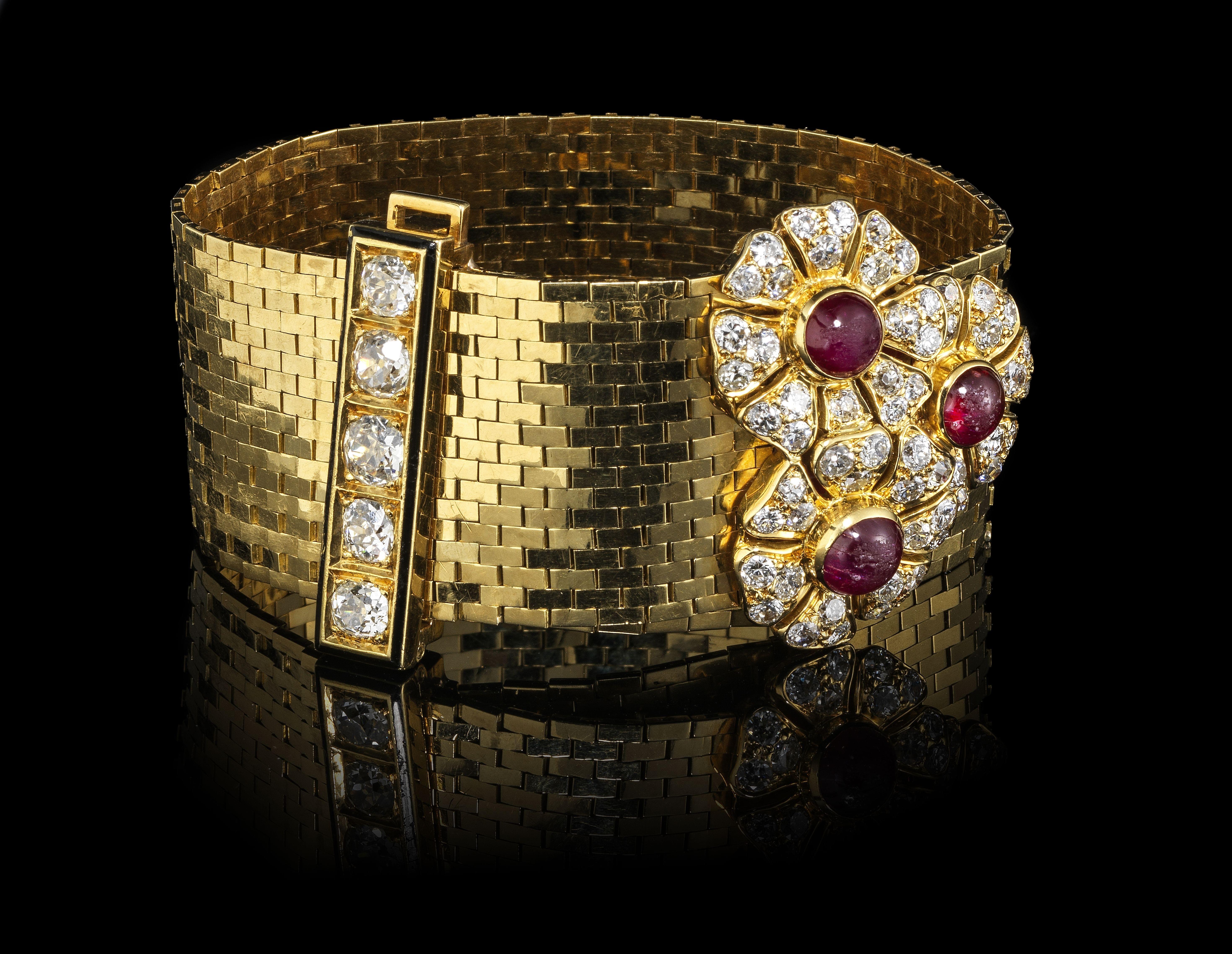 Orné d'un motif de trois fleurs centrées de rubis taille cabochon et aux pétales pavés de diamants (total env. 2,5 ct) se fermant par une barrette émaillée noire sertie d'une ligne de diamants taille ancienne (total env. 2,5 ct), travail français, numéroté 46671, or 750, L ajustable jusqu'à 20 cm, 95 g. Un modèle similaire signé Van Cleef & Arpels nommé "Ludo Briquettes" a été vendu GBP 35'000, voir lot 177 de la vente du 13 décembre 2016 de Sotheby's.