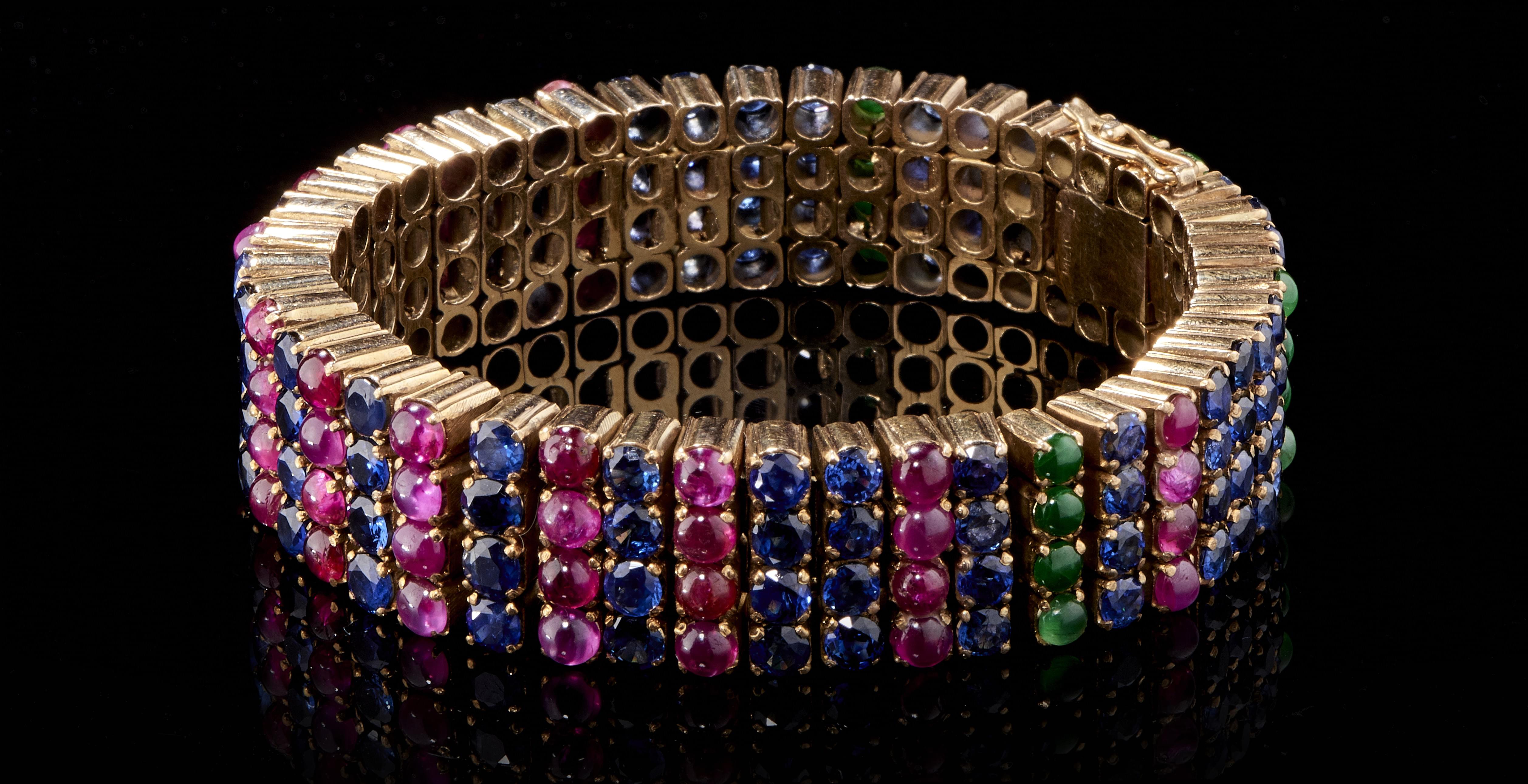 690. Bracelet manchette souple serti de lignes de saphirs, rubis et d'émeraudes