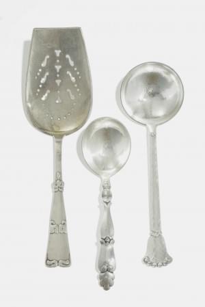 528. Pelle de service ajourée et deux cuillères modernistes à manche...