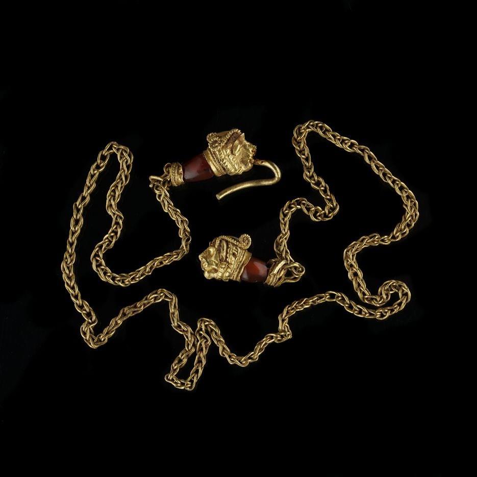A motif de têtes de taureaux serties de pierres rouges, or, poid...