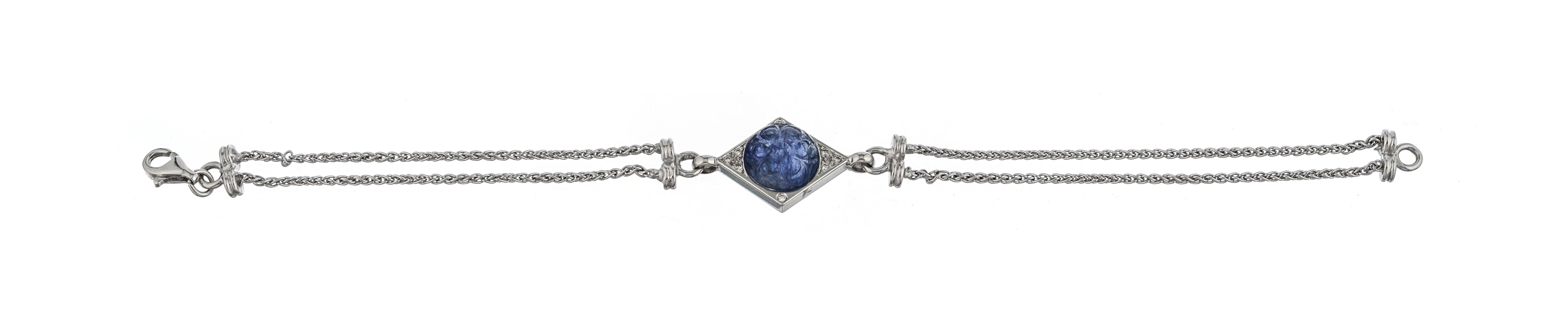 986. Bracelet retenant un motif serti d'un saphir sculpté en fleur réhaussé de diamants