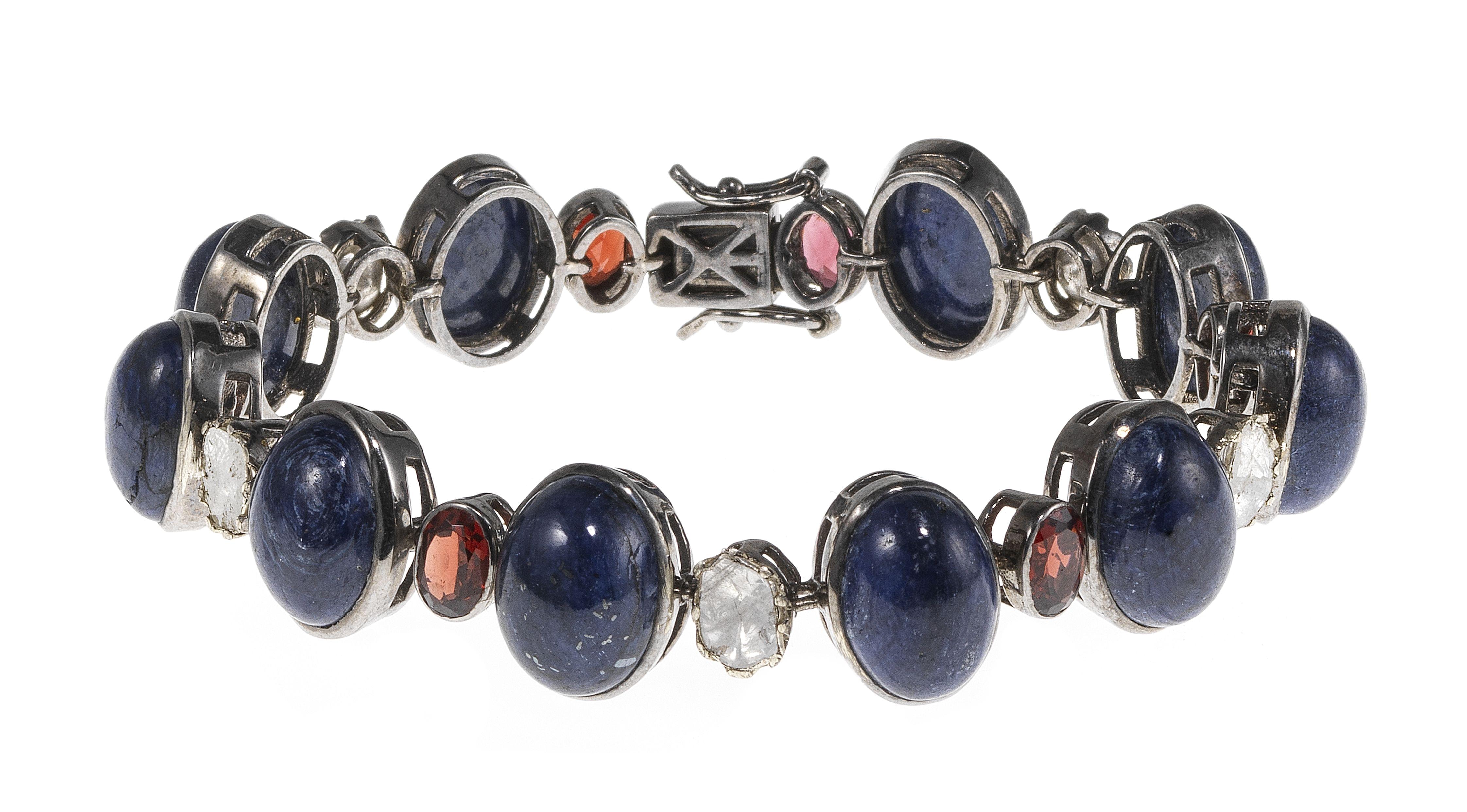 3129. *Bracelet serti de sodalites taille cabochon alternées de grenats taille ovale et de diamants en table