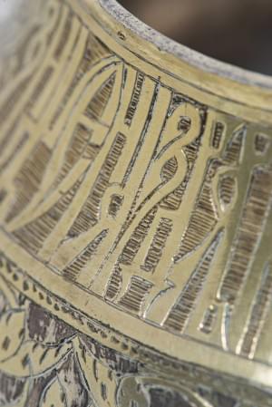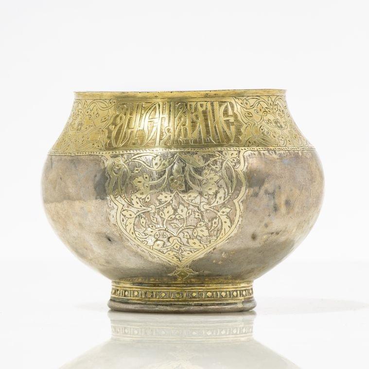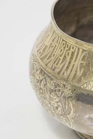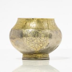 72. Bratina, c’est-à-dire coupe de fraternité, à décor de grands lambrequins ornés de rinceaux et de l'inscription "Братина добра / ч[е]л[о]в[е]ка питии / н[]е на здравие" (Bratina d'un honnête homme, buvez y à -y à votre santé), argent et vermeil, début du XVIIe siècle, H 10 cm, 230 g