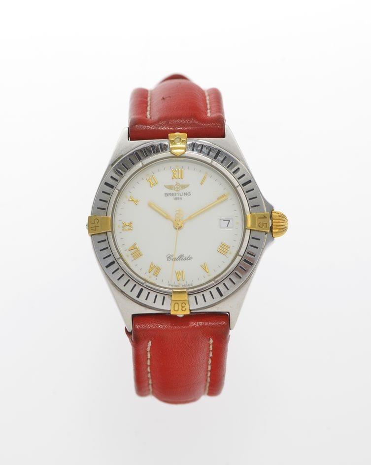 Cadran blanc, chiffres romains et aiguilles dorés, date à guichet à 3h, réf B57045, acier, D 34 mm