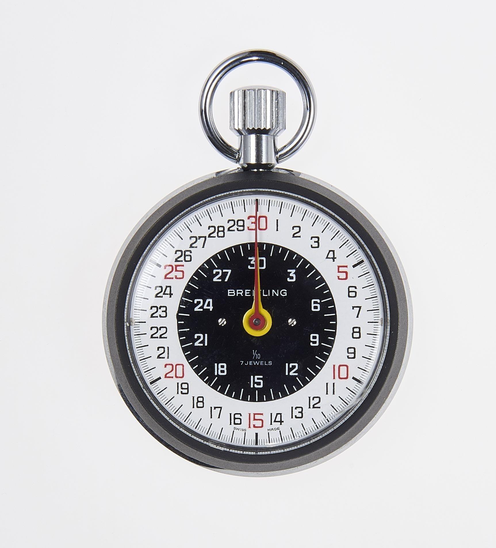 Cadran noir et blanc, aiguilles rouge et jaune, chiffres arabes noirs et rouge, acier, D 55 mm