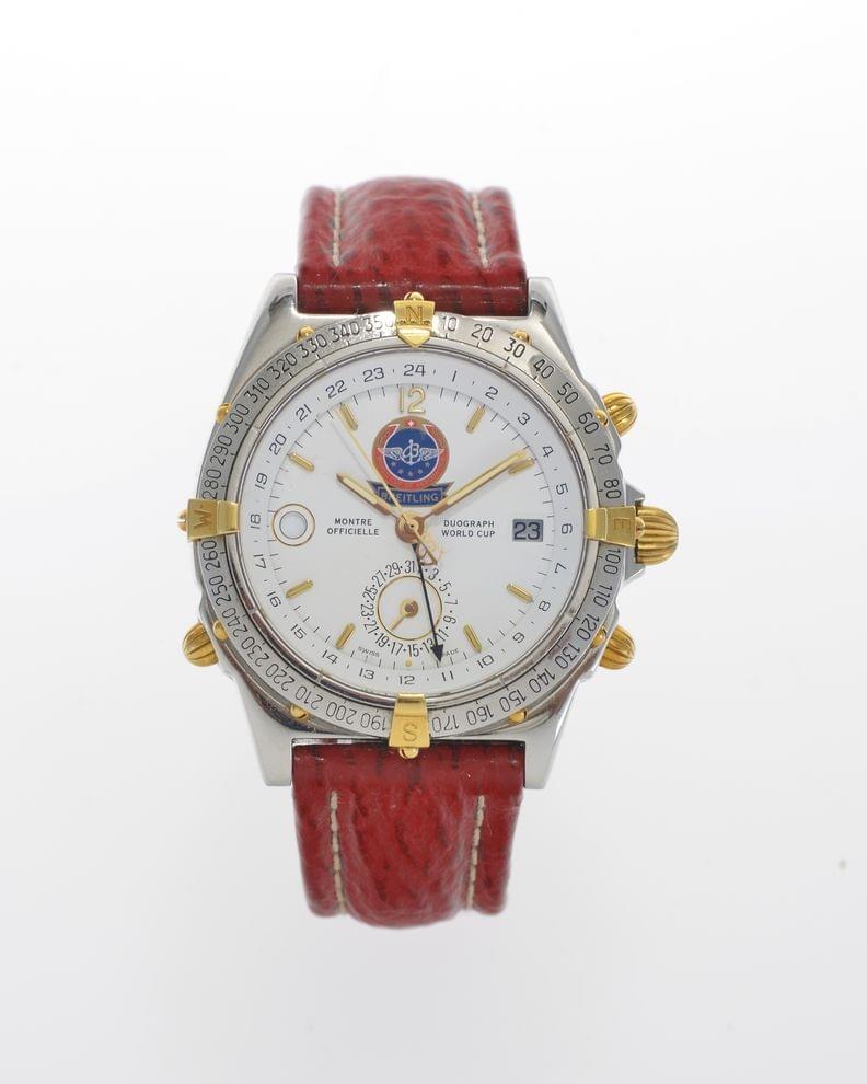Créée pour la World cup of aerobatics, deuxième fuseau horaire, cadran blanc, date à guichet à 6h, indication jour/nuit à 9h, lunette tournante, éd. limitée n°775/1000, réf B15 508, bracelet en cuir rouge, 1995, acier, D 38 mm