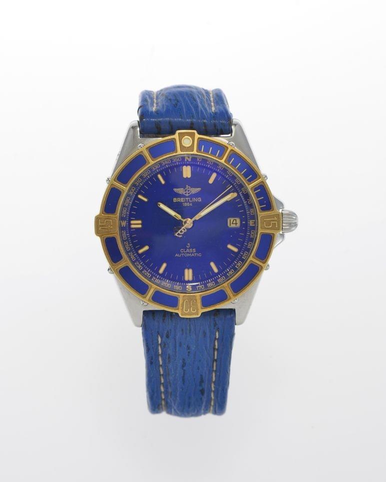Cadran bleu, index bâton, date à guichet à 3h, lunette tournante, réf D 10067, bracelet en cuir bleu, années 90, acier, D 39 mm