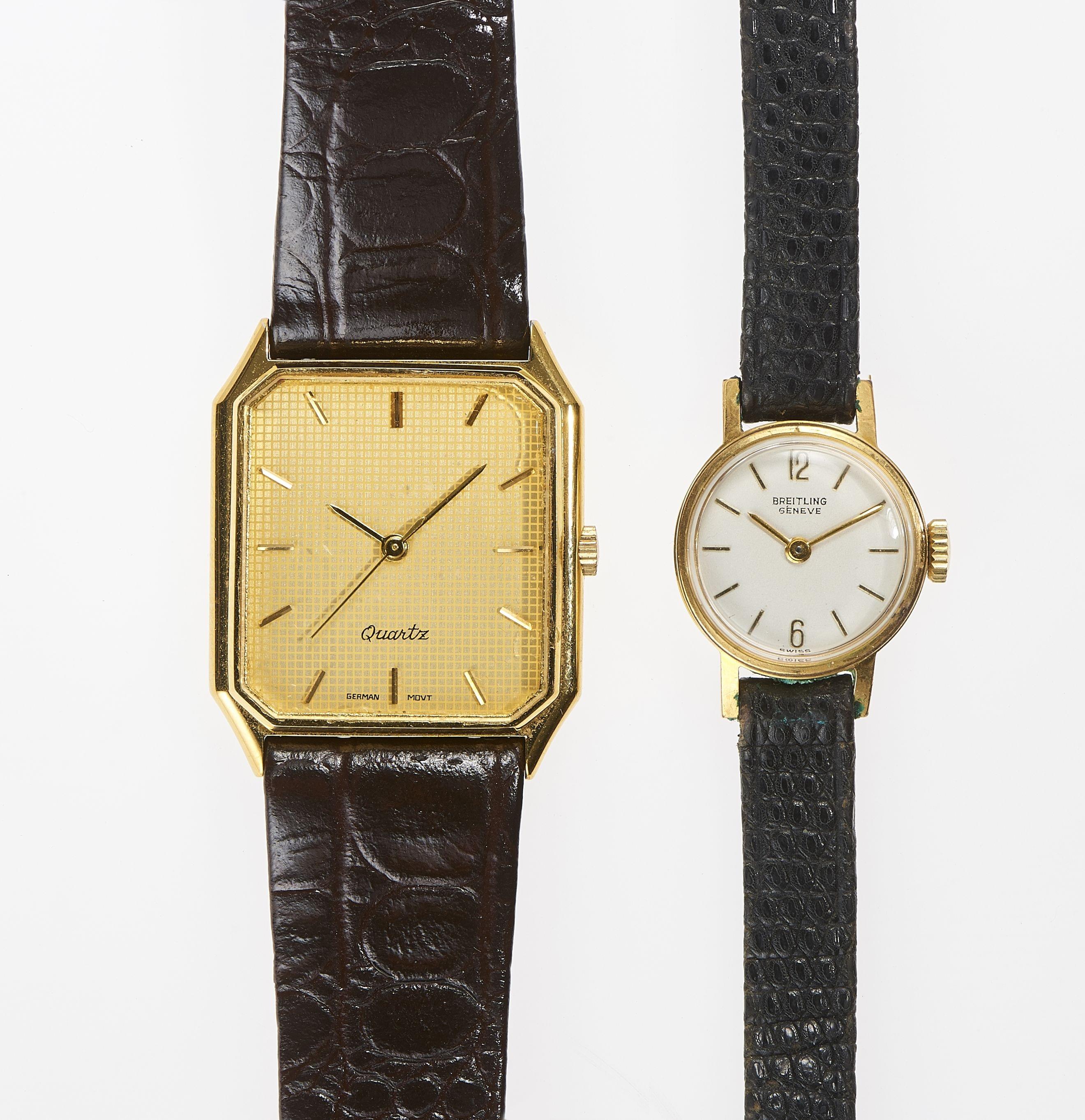Cadran gris, aiguilles dorées, chiffres arabes et index bâtons dorés, métal doré et acier, D 17 mm. On joint une montre carrée à quartz à cadran doré, aiguilles et index bâtons dorés, métal doré et acier, 25x25 mm.