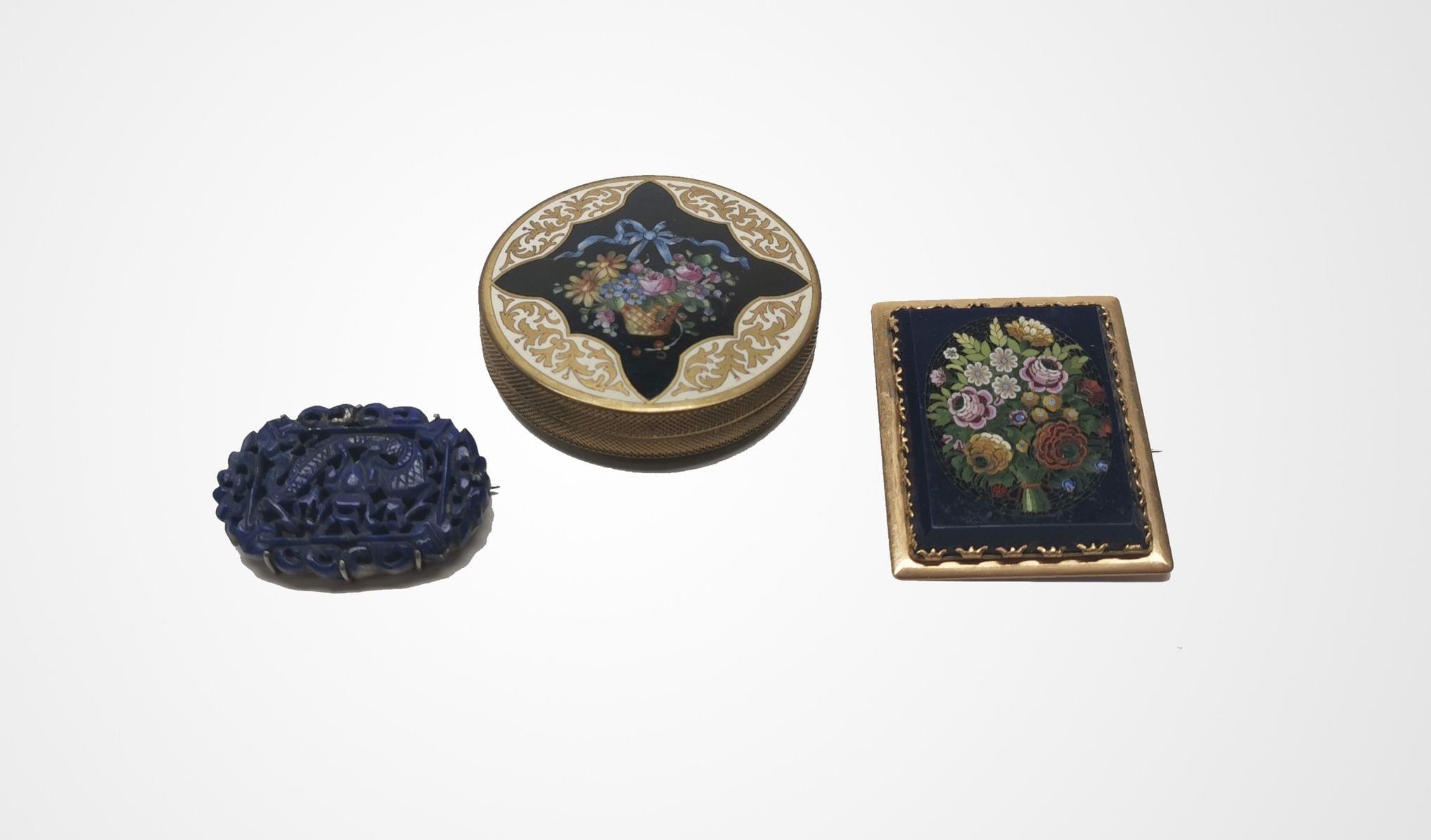 Monture en or 750, tige en métal, 44x36 mm, poids brut 20 g. On joint une broche en lapis-lazuli sculpté à décor ajouré de dragon et un poudrier émaillé à décor de panier fleuri peint, métal et métal doré, 25x35 mm et D 5 cm.