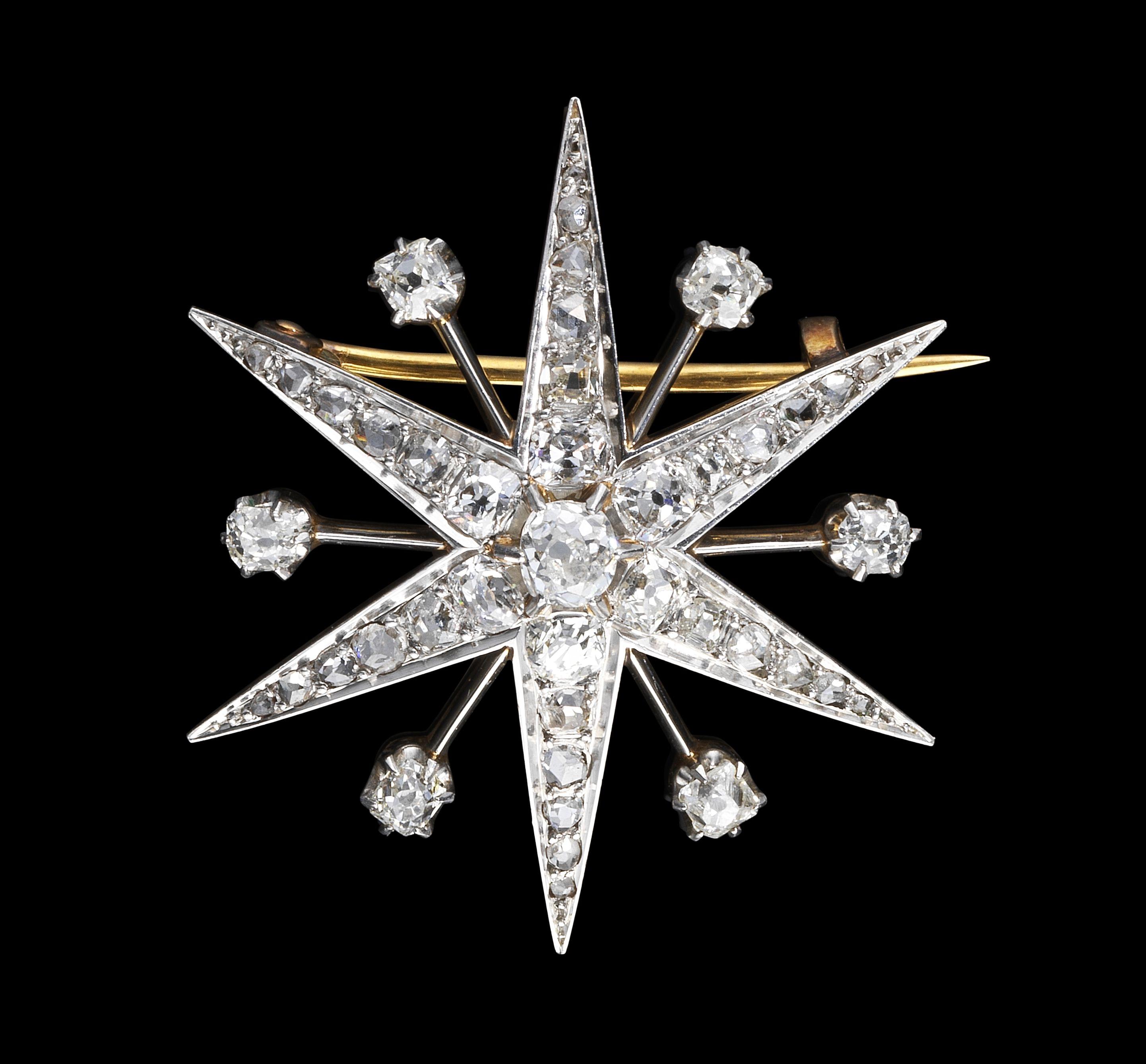3279. Broche à motif d'étoile sertie de diamants taille ancienne et roses de diamant (env. 1,5 ct)