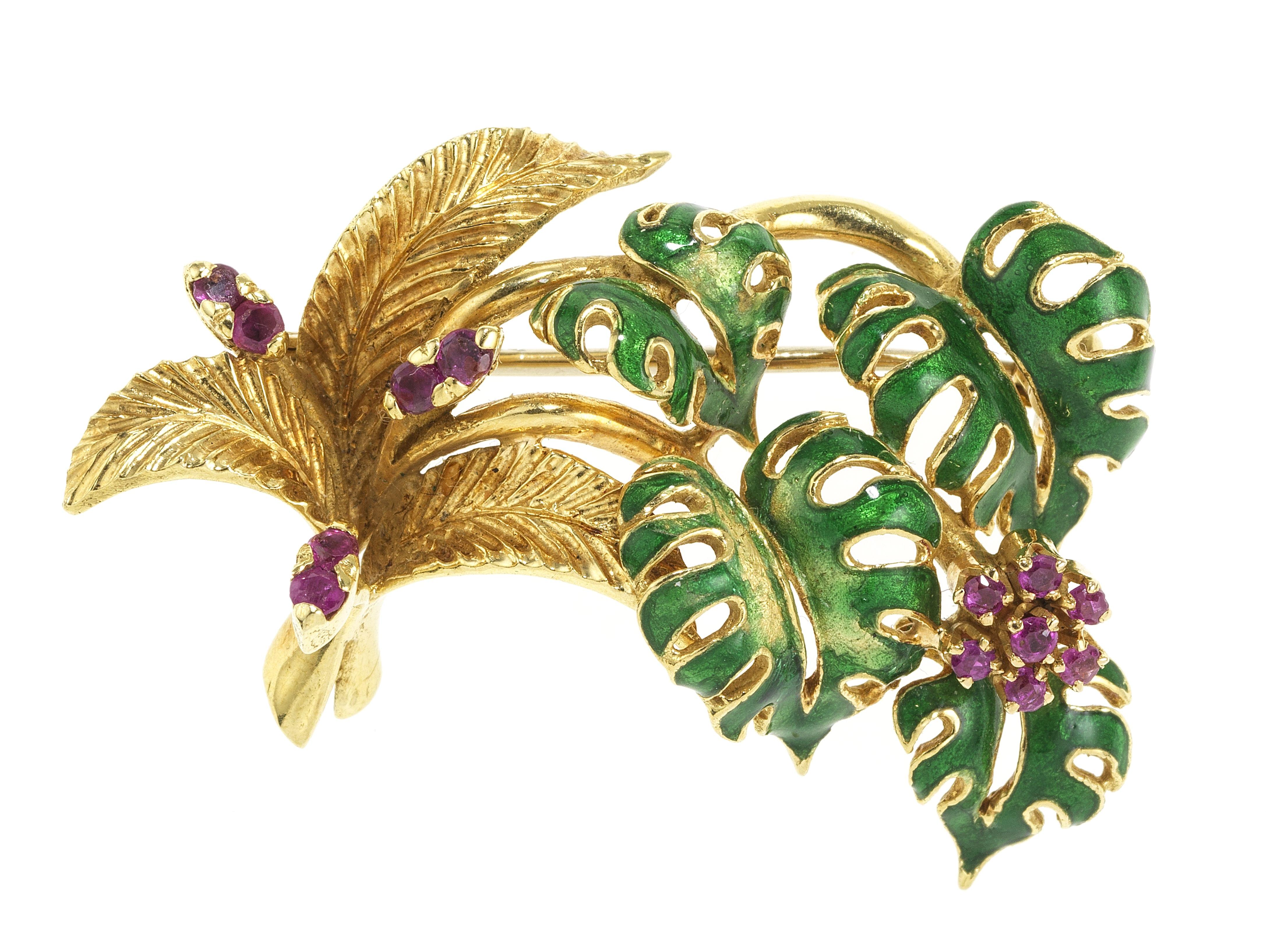3318. Broche à motif de bouquet aux feuilles émaillées vertes et sertie de rubis