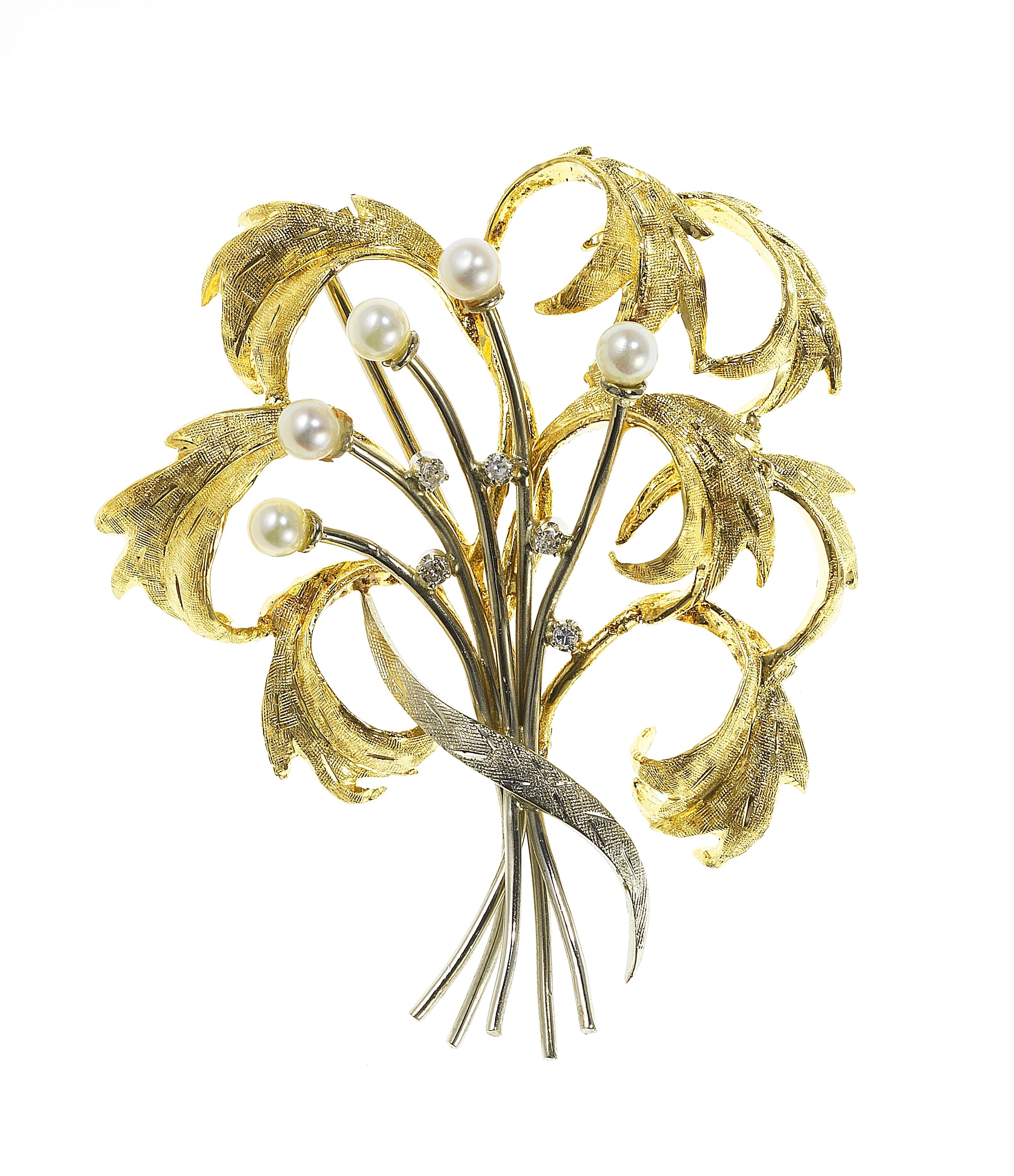 3194. Broche à motif de bouquet sertie de perlettes (D env. 3 mm) et de saphirs blancs
