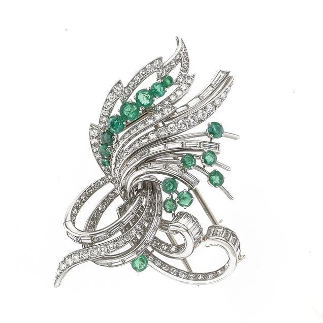 251. Broche à motif de feuille sertie d'émeraudes (env. 1.8 ct) et de diamants taille brillant et taille baguette (env. 3 ct)