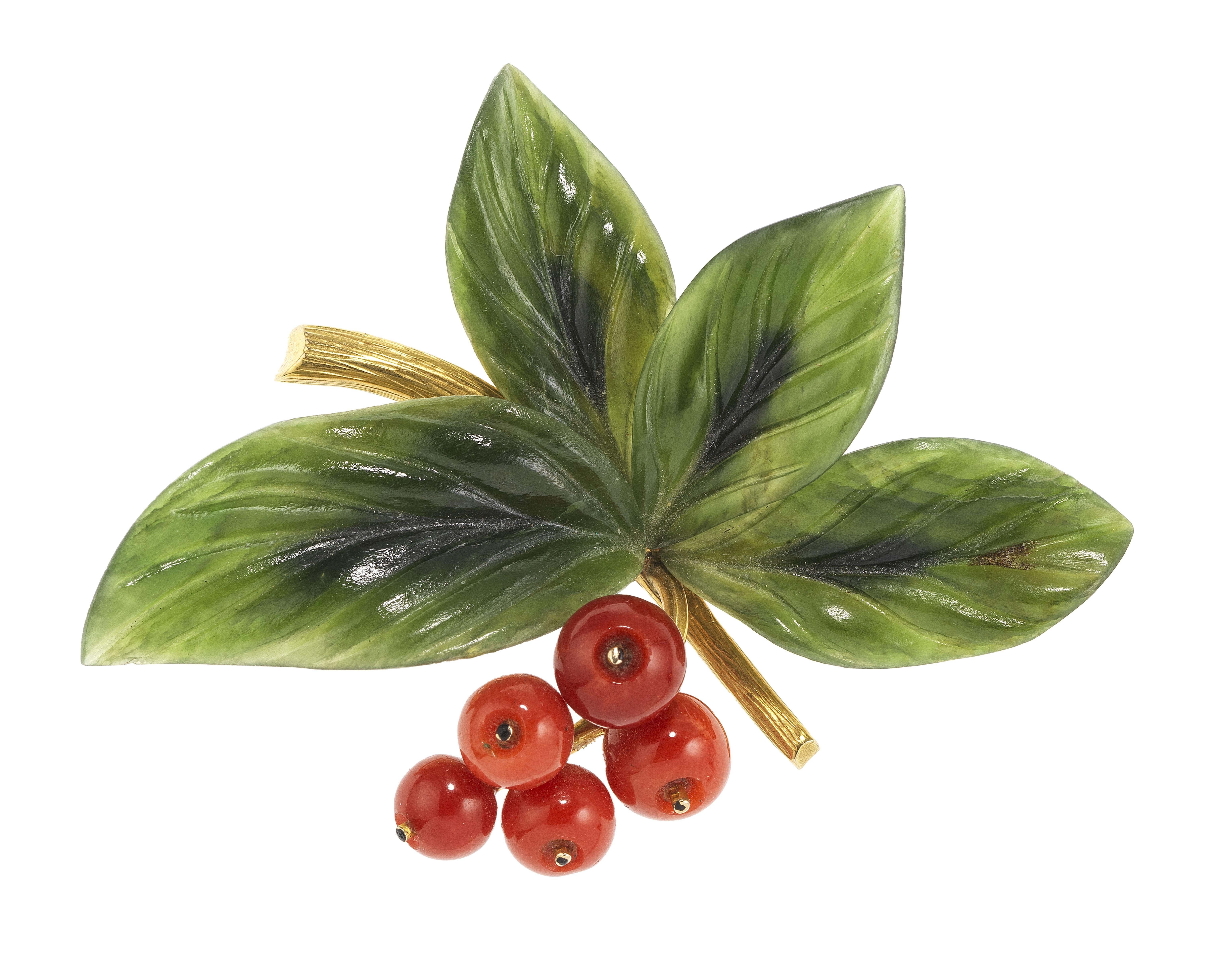 3279. Broche à motif de fruits rouges en corail rehaussés de feuilles de jade