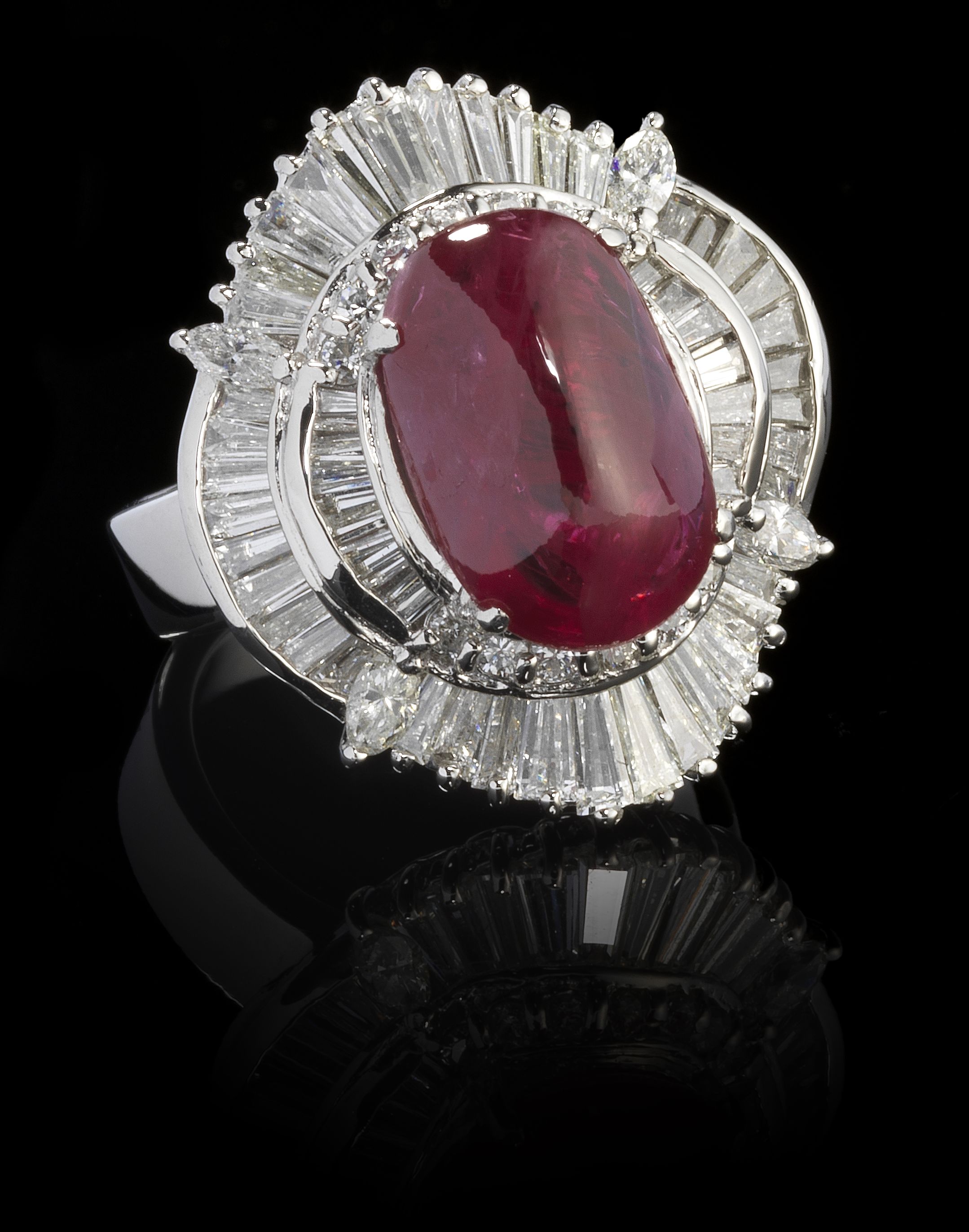 35. *Bague sertie d'un rubis birman en pain de sucre (7,25 ct)