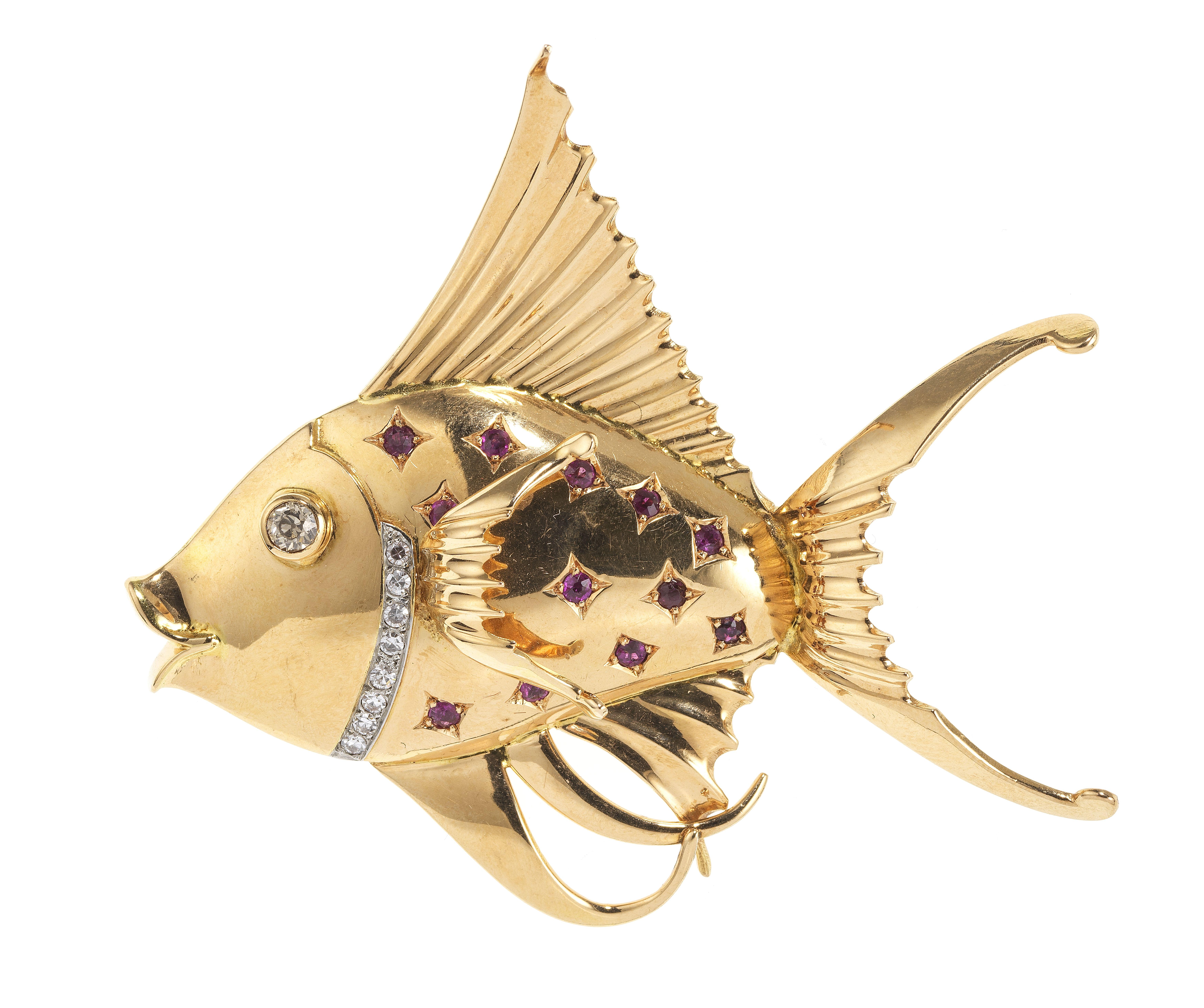 3420. Broche à motif de poisson serti de rubis et de diamants