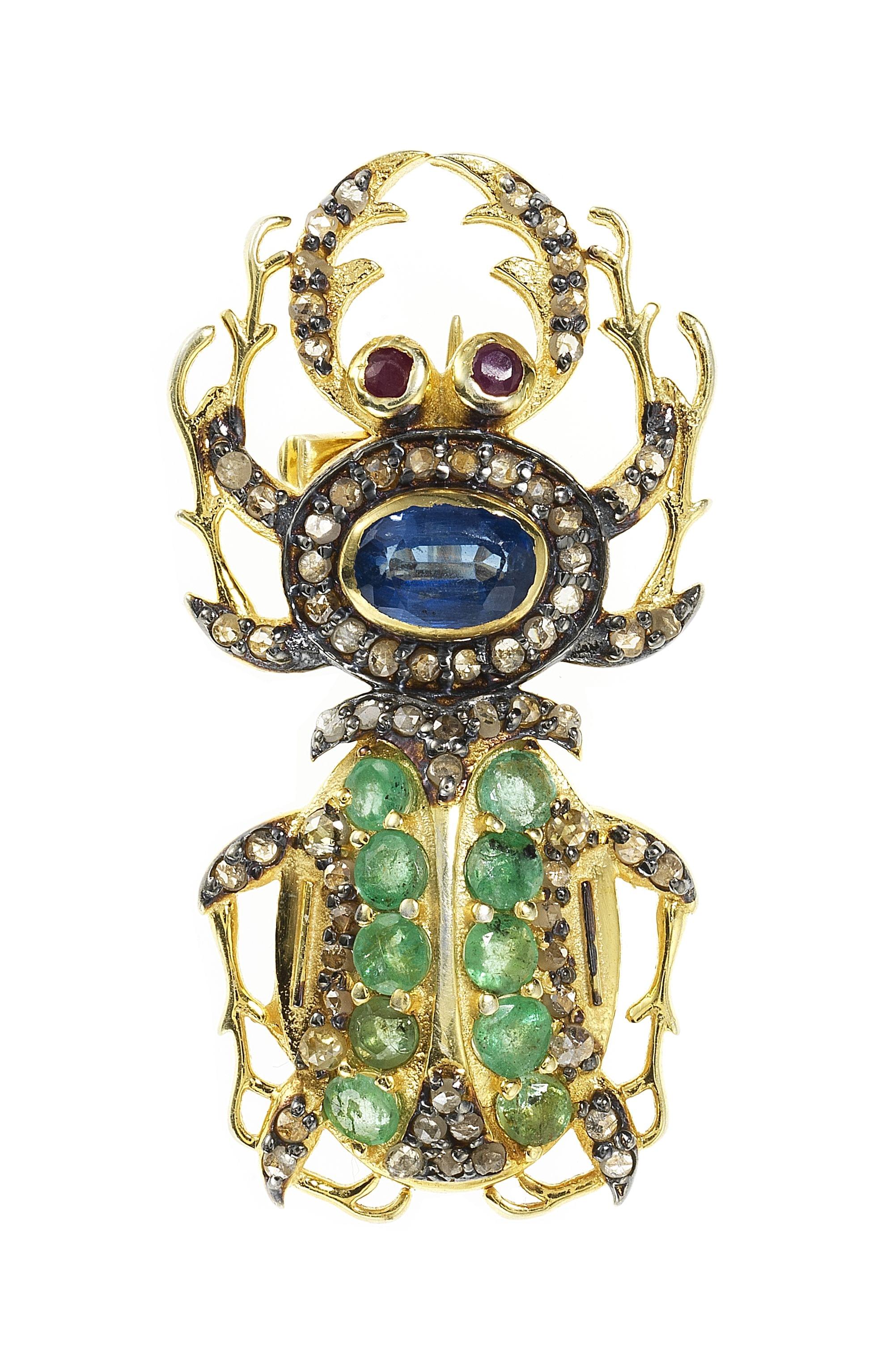 Centré d'un saphir taille ovale entouré de roses de diamants, aux yeux sertis de rubis et au corps pavé d'émeraudes, vermeil 925, L 3,5 cm. Pour les lots précédés d'un *, la TVA de 7,7% est due sur l'entier du prix d'adjudication.