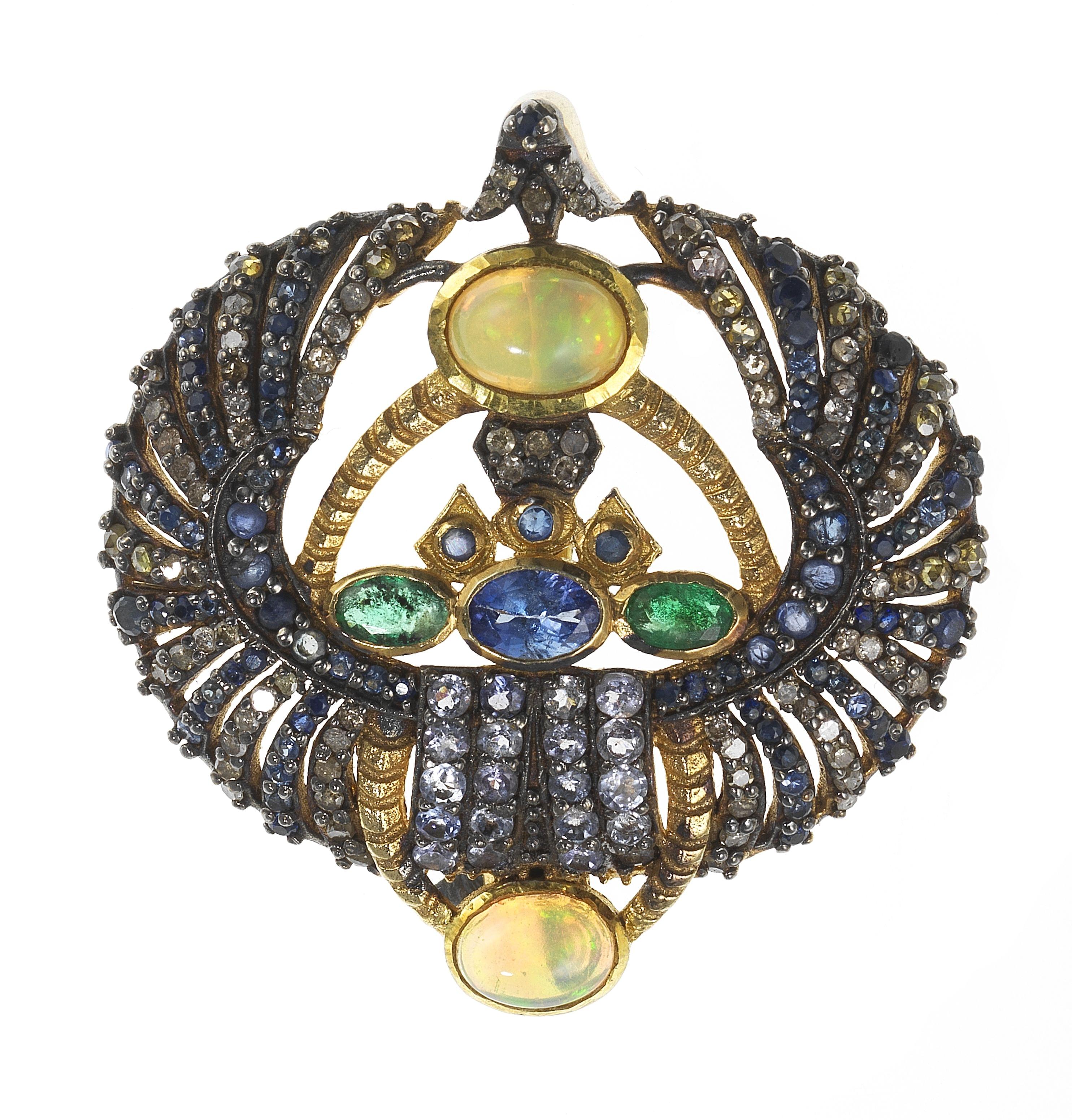 Serti de deux opales taille cabochon, d'un saphir taille ovale, d'émeraudes taille ovale et pavé de saphirs et roses de diamant, vermeil 925, H 4 cm. Pour les lots précédés d'un *, la TVA de 7,7% est due sur l'entier du prix d'adjudication.