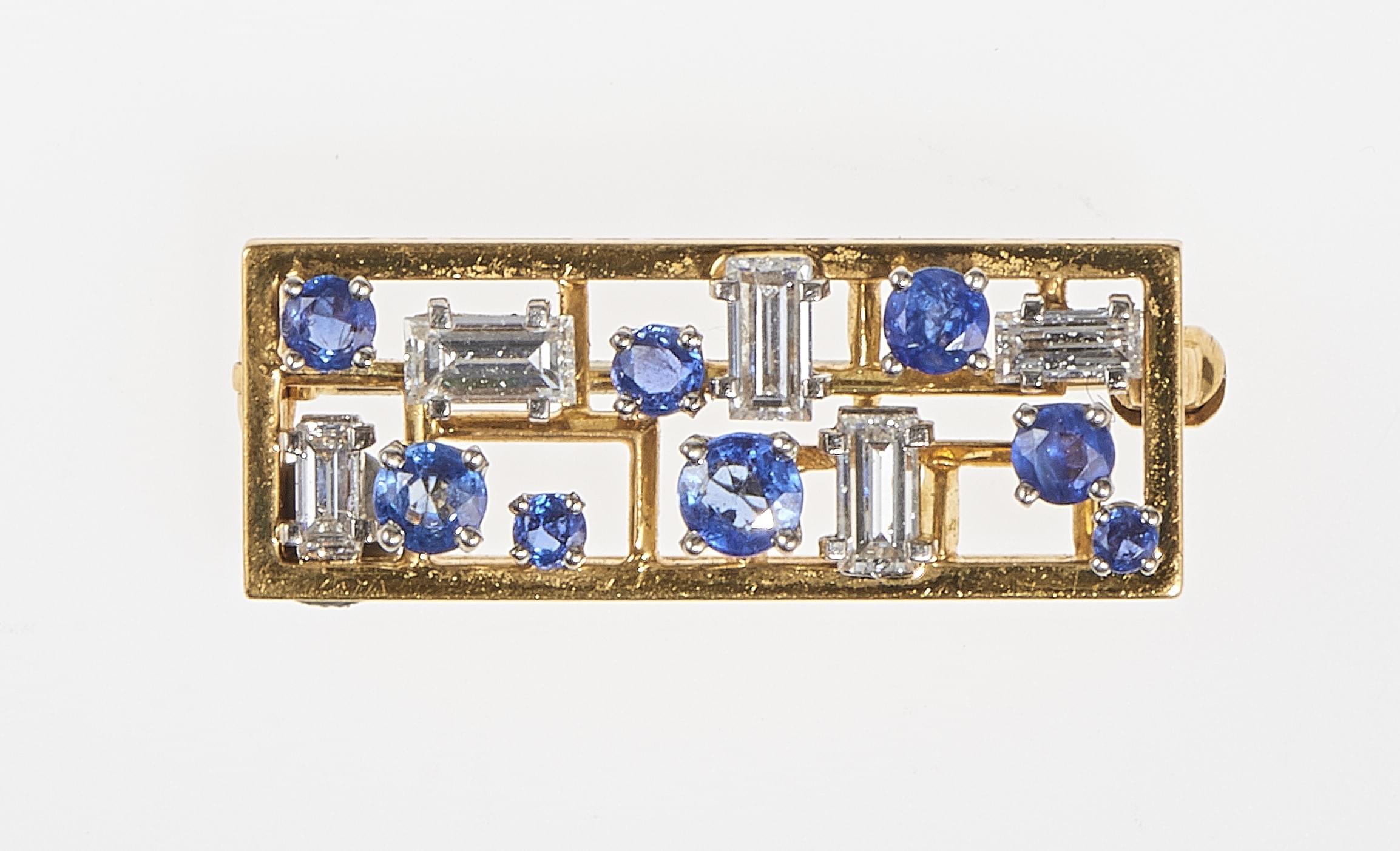 3215. Broche ajourée sertie de diamants taille baguette et de saphirs taille brillant