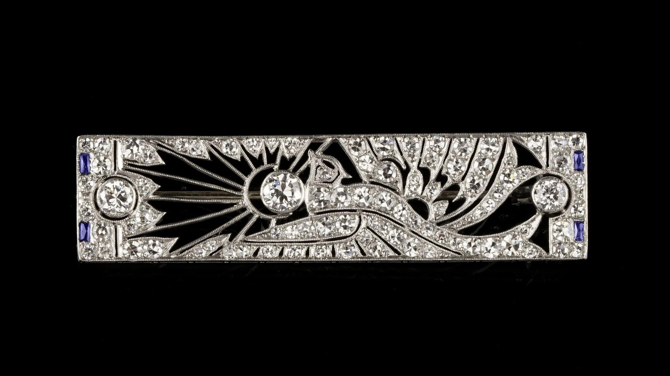 659. Broche Art Déco à motif d'un oiseau sertie de diamants demi-taille (env. 0,8 ct) et de petits saphirs calibrés