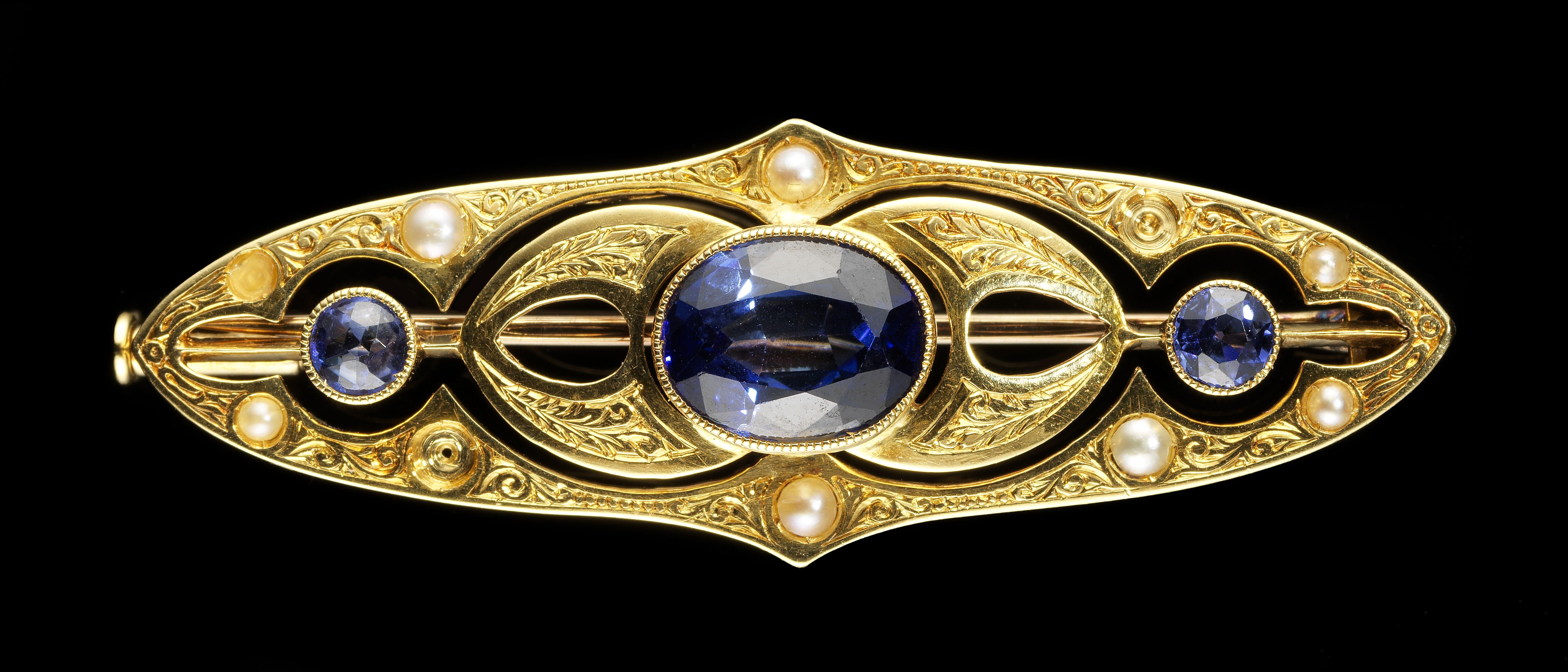 3311. Broche barrette ciselée sertie d'un saphir taille ovale synthétique et de demi-perles