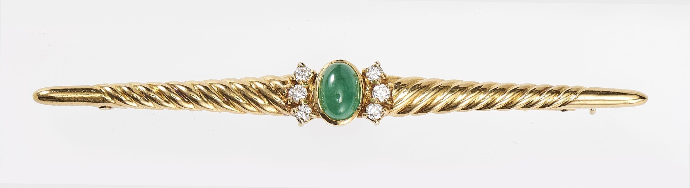 3369. Broche-barrette godronnée sertie d'une émeraude taille cabochon (env. 0,8 ct) rehaussée de diamants