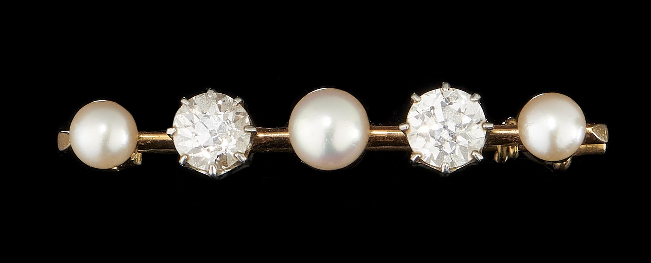 971. Broche barrette sertie de trois perles alternées de deux diamants taille ancienne (env. 1,4 ct)