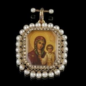 589. Mère de Dieu de Kazan, icône pendentif entourée de roses de diam...