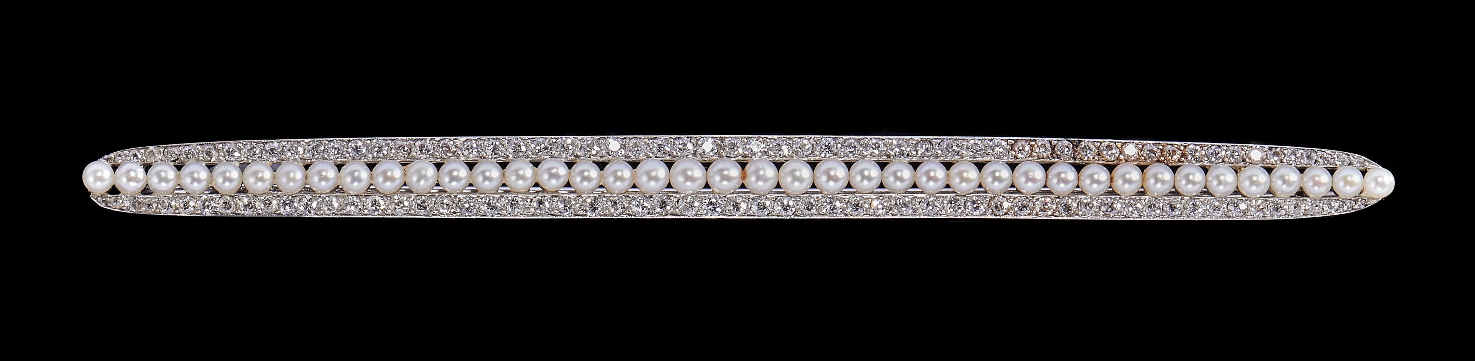 601. Broche barrette sertie d'une ligne de perles entourées de diamants (env. 2 ct)