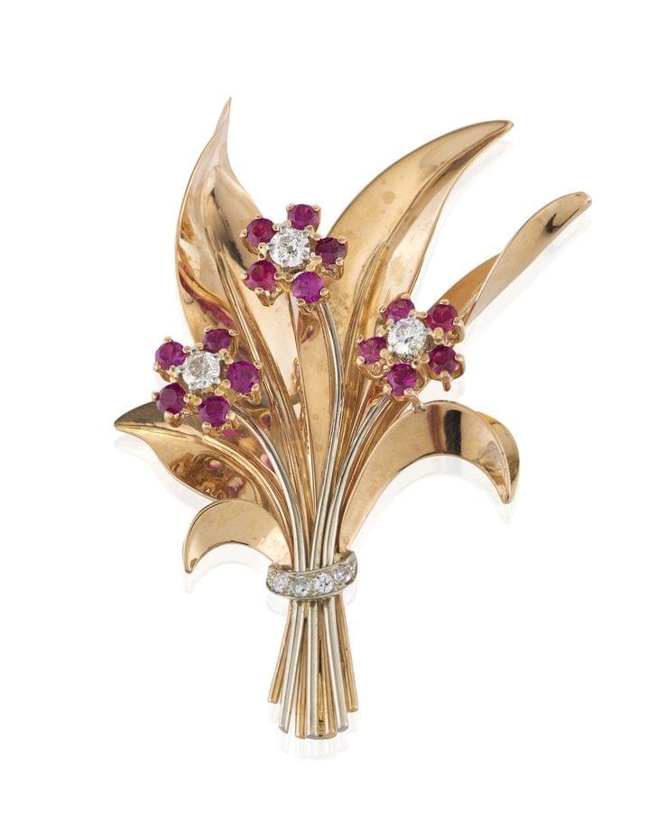 50. Broche bouquet sertie de diamants et de rubis synthétiques